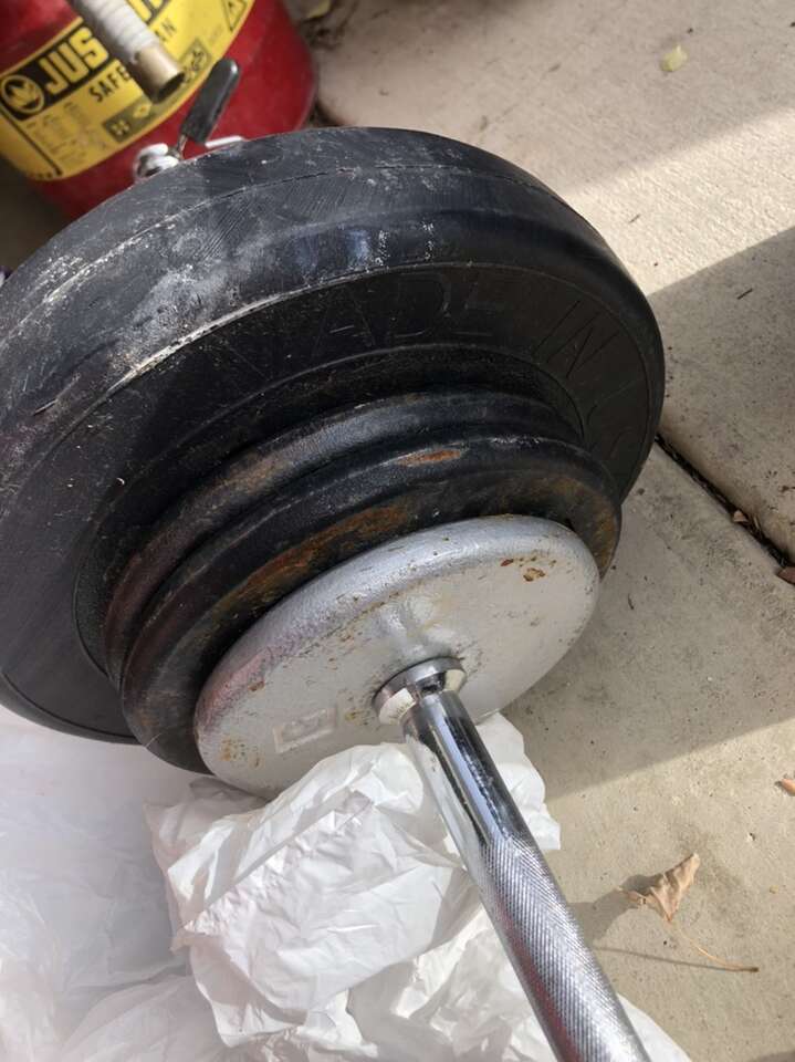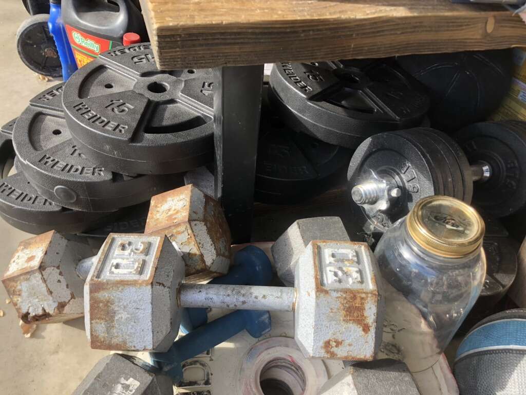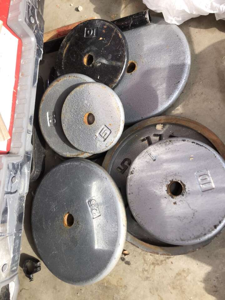 8 pound dumbbell set 15$ Dumbbells 85 cents per pound. Battle rope 45$ Perfect pull up rotating grips 10$ 20# dumbbell single 15$ 25# dumbbell pair 35$ Weight plates 55cents per pound
