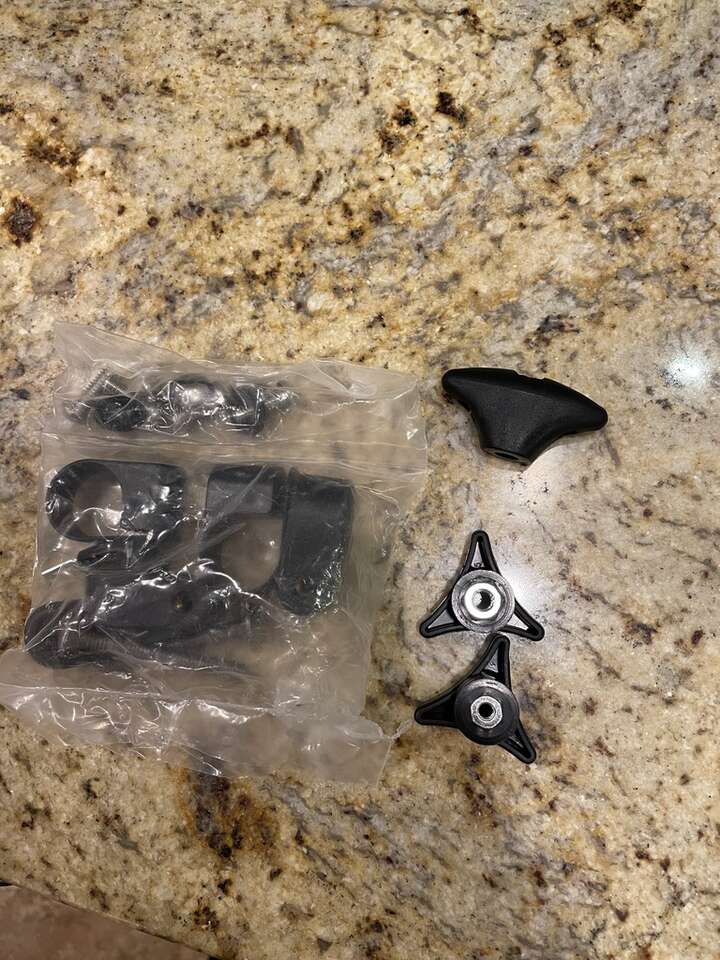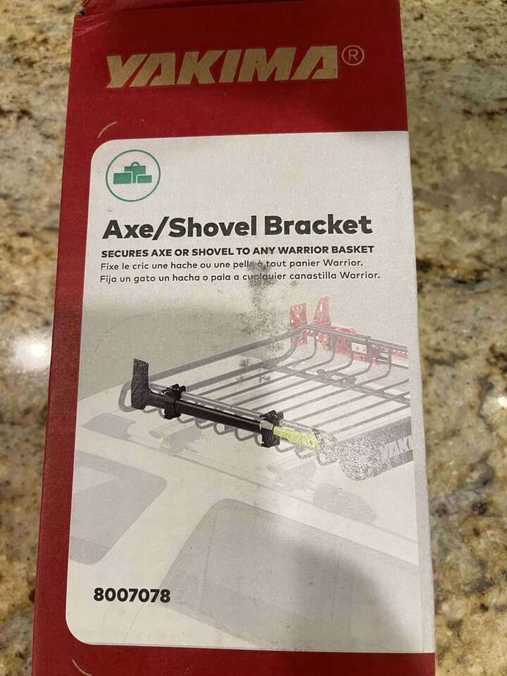 Selling two complete Yakima Axe and Shovel brackets compatible with LoadWarrior and MegaWarrior racks. The red box is new and unopened. The brown box is complete but has replacement knobs as one of the stock knobs was raided from the box. I will include the single stock knob but the kit requires two so you will have an extra knob if you choose the brown box. In the second picture you can see the leftover stock knob. The third picture shows that same knob with two aftermarket replacement knobs I bought at Ace Hardware. Unfortunately, Yakima will not sell replacement knobs. The new unopened box if $50. The box with the replacement knobs is $40.