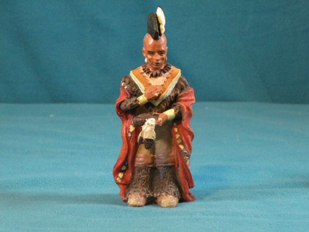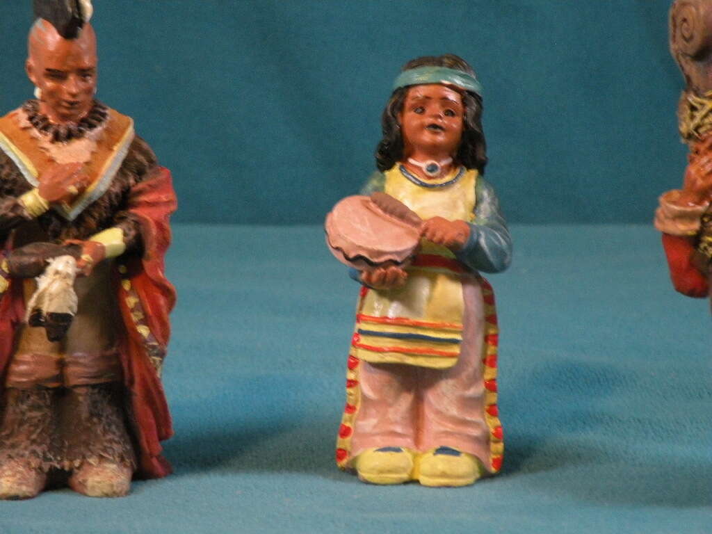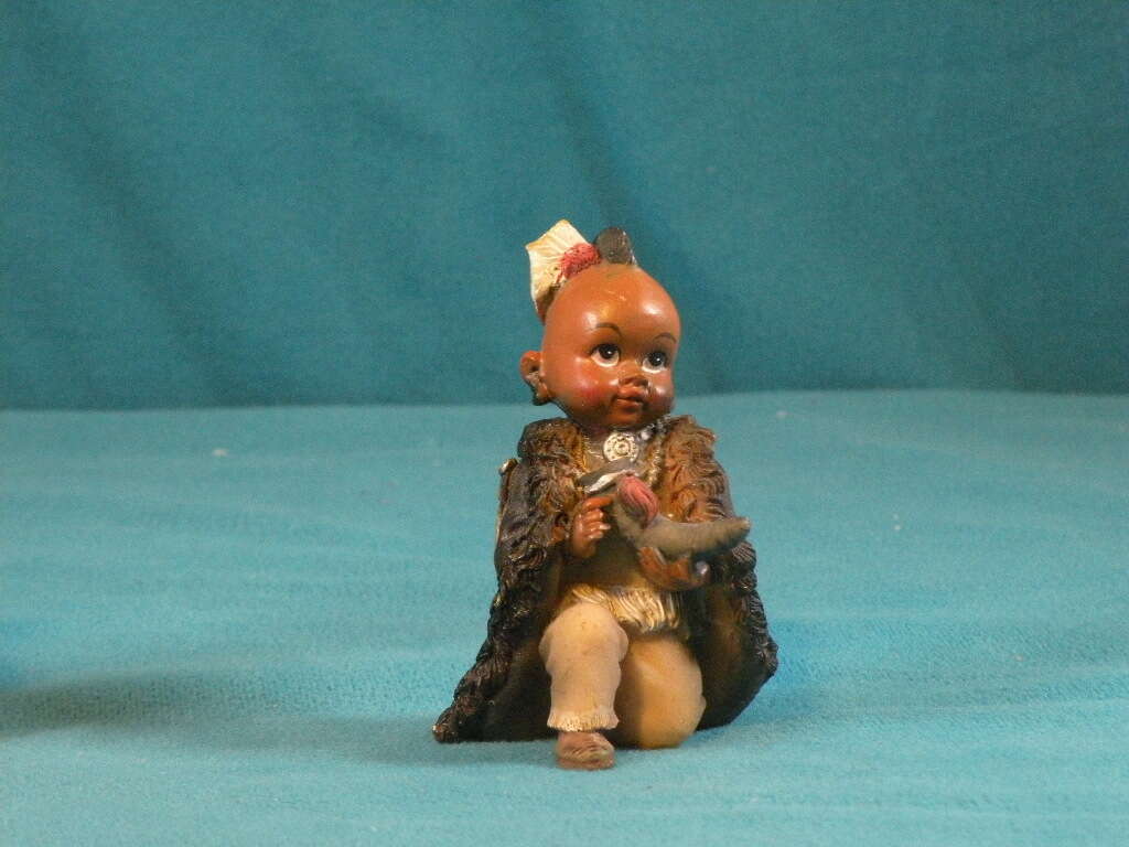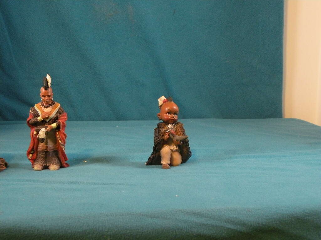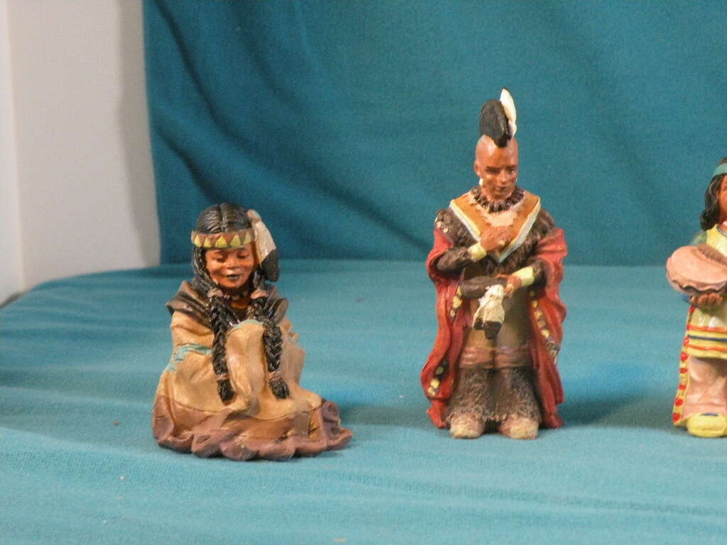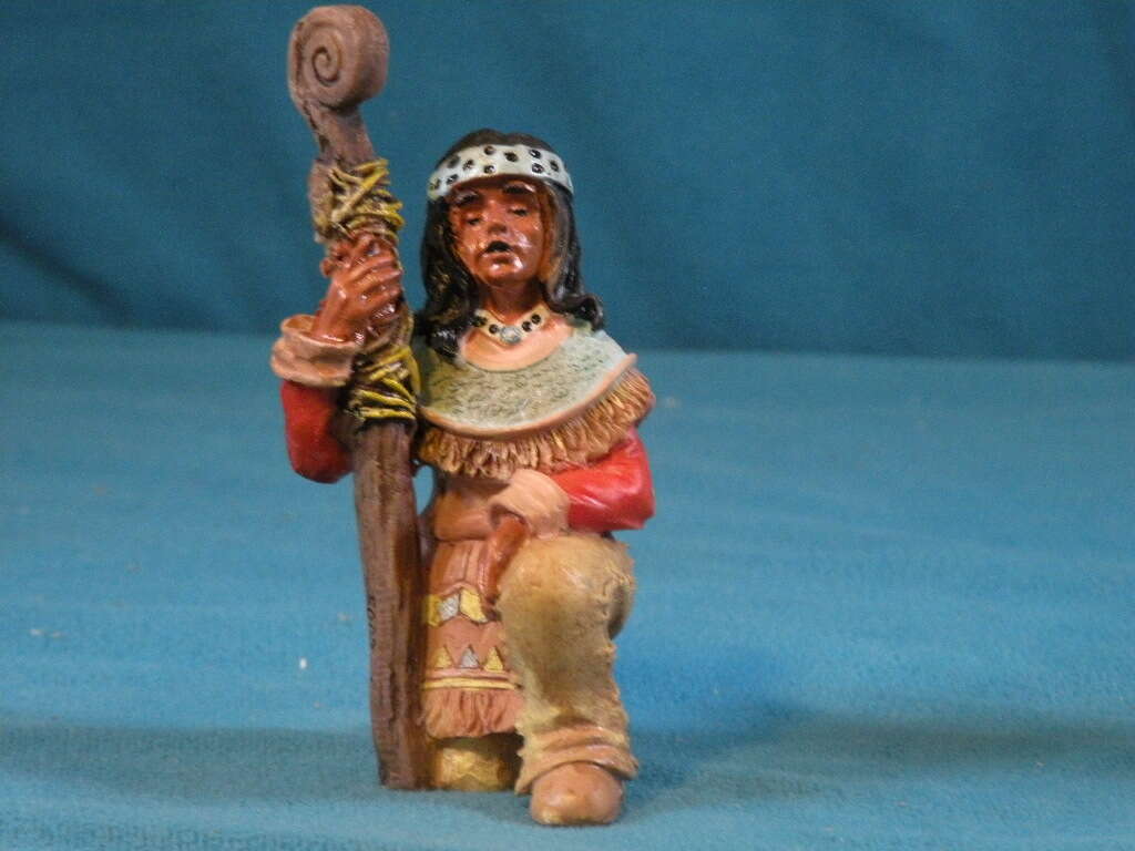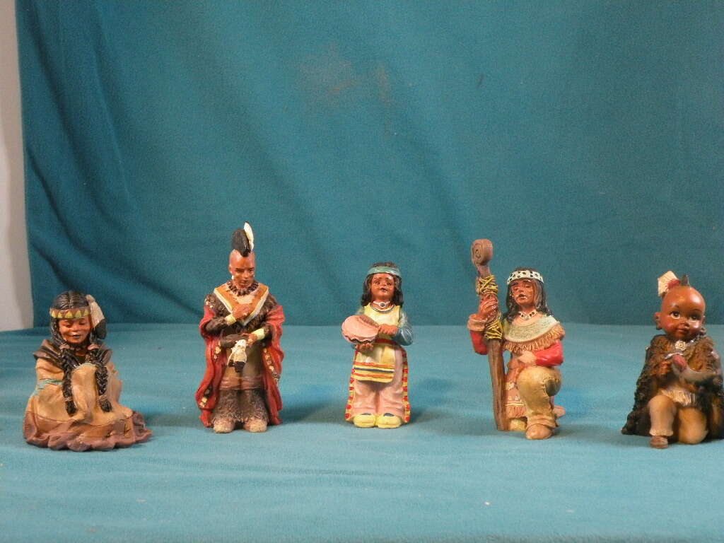Native American Indian Sculptures of Children Dressed in Different Costumes. These are unique and exquisitely detailed from their expressions to their clothing. Each one is hand carved and coated and hand painted. Signed by the Artist. WMG 2003. They are absolutely adorable and make a great addition to your collection. The boy has a staff and is kneeling to represent a shepherd. The girl is wrapped in her coat to keep warm,and her eyes are closed as if she'spraying. The other little girl has an instrument she is playing. The littlest boy is dressed in a long coat with fur and is holding a buffalo horn.( He doesnt have a signature on him.) All in Excellent condition.