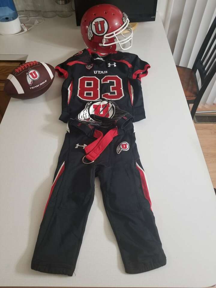 I have a black and red Utah Utes PAC12 game worn uniform for sale. The Jersey is #83 Fitzgerald. The pants showcase the Under Armour patch on one side and the drum & feather patch on the other. The stripes on the Jersey and pants line up nicely. The black and red gloves match the uniform. They are made by Under Armour and showcase the drum & feather on the palms. Included with this uniform is a team issue football. This is the same football the Utes use on the field. A Schutt red helmet with white facemask, drum & feather logo on the side of the helmet complete this uniform. This is for the ultimate Utes fan and would be a nice addition to any man cave or she shed.
