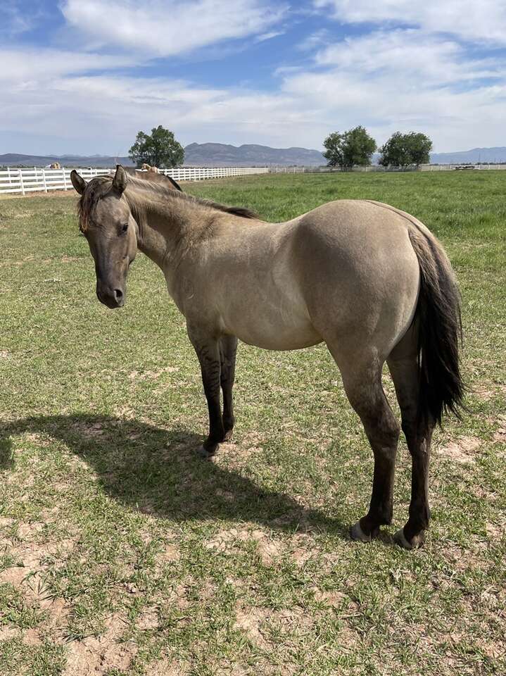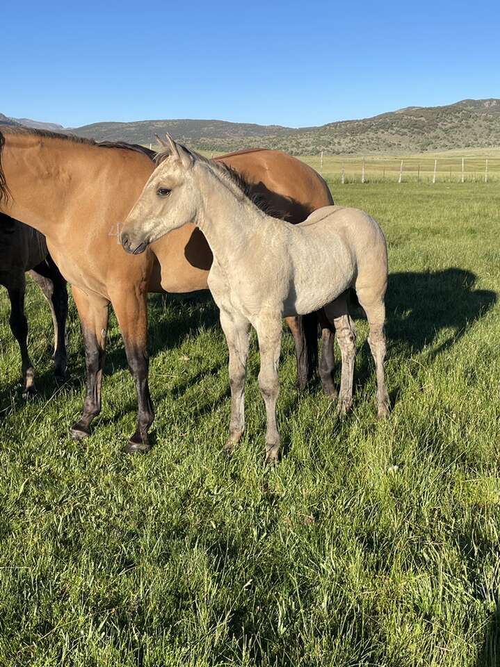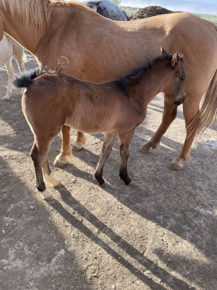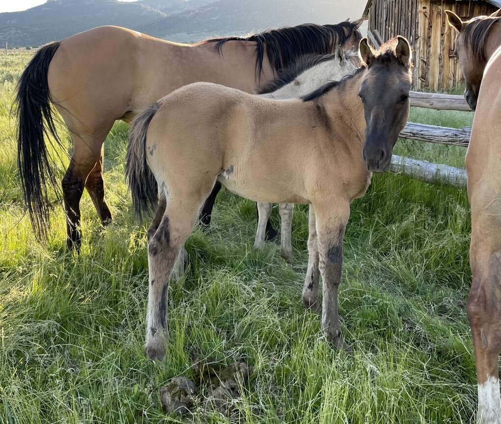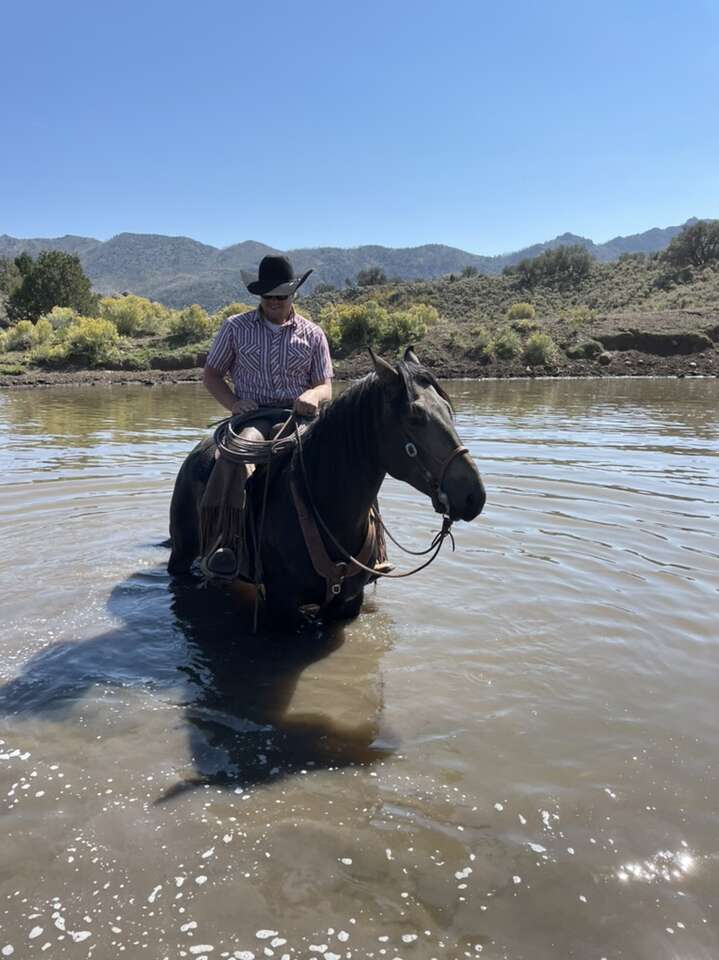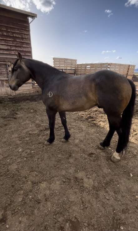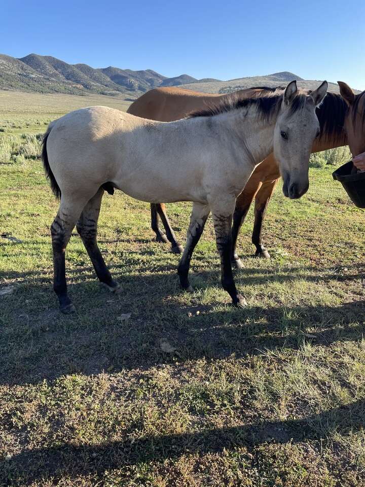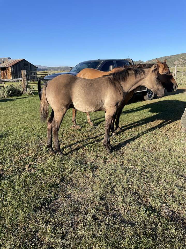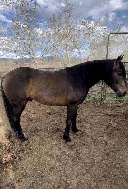 Doc is a buckskin half draft, he is 1/2 Percheron 1/2 quarter horse, he stands at 16 hands and is over 1500lbs(last we checked) and wears a #4 shoe! We’ve used him in all a aspects of ranch work! He’s super cowy and very athletic, along with a great disposition that he passes onto his foals! We have roped bulls, cows, doctored calves and brand calves on him every year! We have packed deer, elk and salt with no problems! We trailer him next to geldings and mares, as well as working all day long next to them with no issues! My wife rode him all winter while she was pregnant, and my son has rode him with me since he was 3 months old! He adds bone and the perfect amount of size to his foals! Videos of him working upon request! Sorrel is one of Doc’s coming 3 yr olds I started last year! The black is another one of Doc’s 2 year olds they are both doing great!