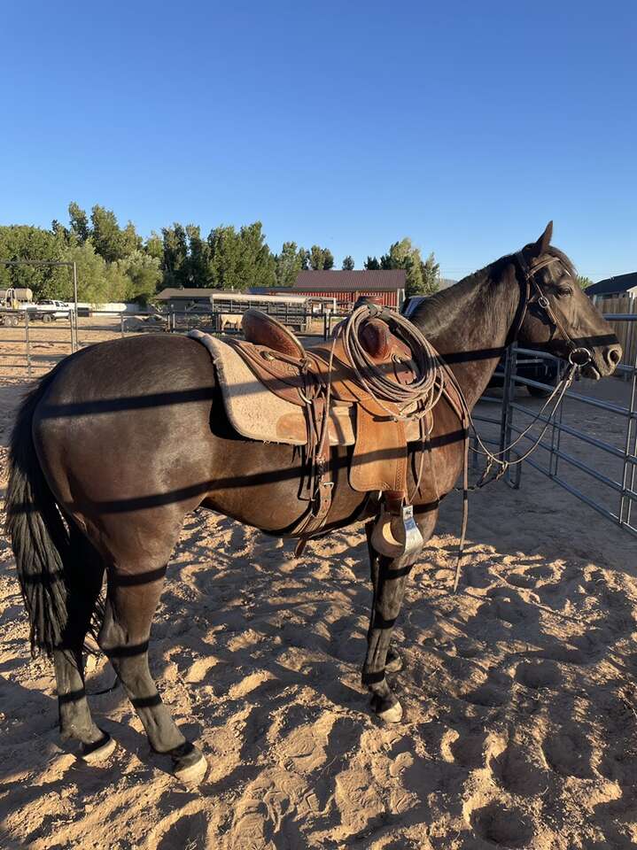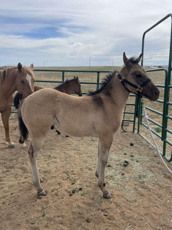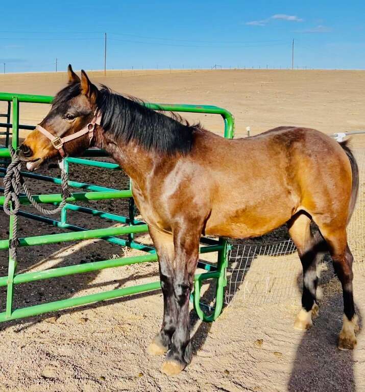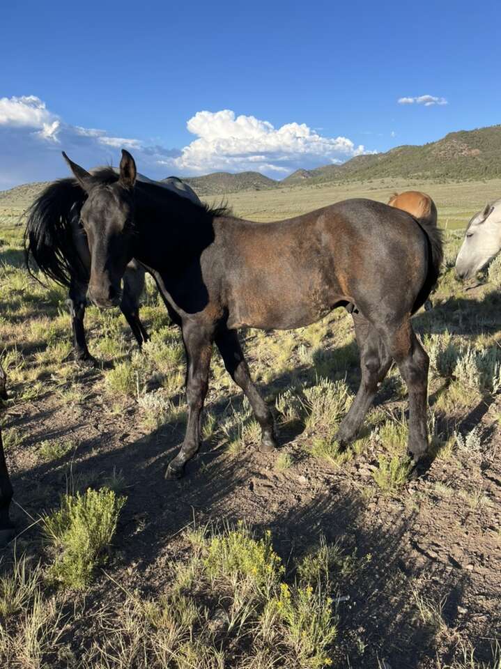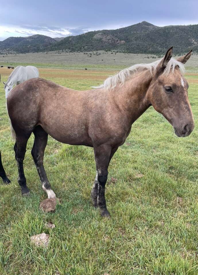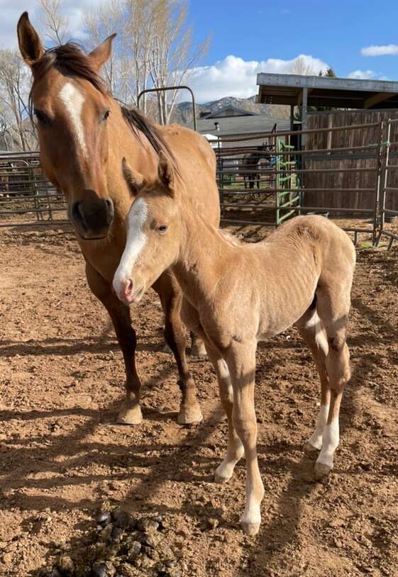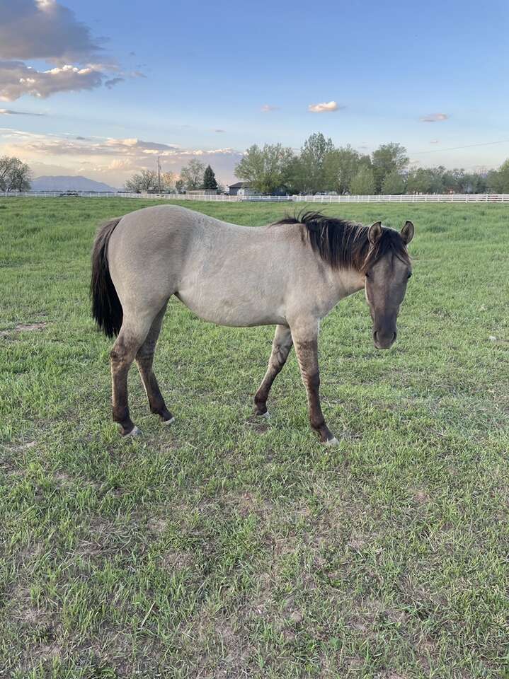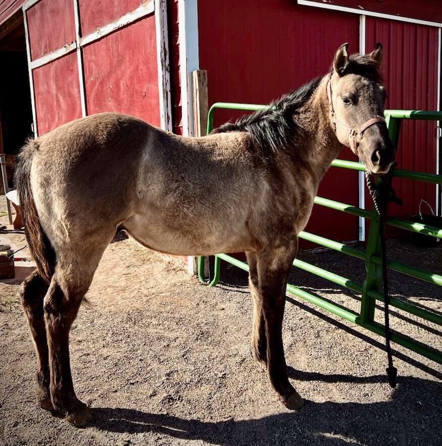 Doc is a buckskin half draft, he is 1/2 Percheron 1/2 quarter horse, he stands at 16 hands and is over 1500lbs(last we checked) and wears a #4 shoe! We’ve used him in all a aspects of ranch work! He’s super cowy and very athletic, along with a great disposition that he passes onto his foals! We have roped bulls, cows, doctored calves and brand calves on him every year! We have packed deer, elk and salt with no problems! We trailer him next to geldings and mares, as well as working all day long next to them with no issues! My wife rode him all winter while she was pregnant, and my son has rode him with me since he was 3 months old! He adds bone and the perfect amount of size to his foals! Videos of him working upon request! Sorrel is one of Doc’s coming 3 yr olds I started last year! The black is another one of Doc’s 2 year olds they are both doing great!