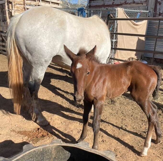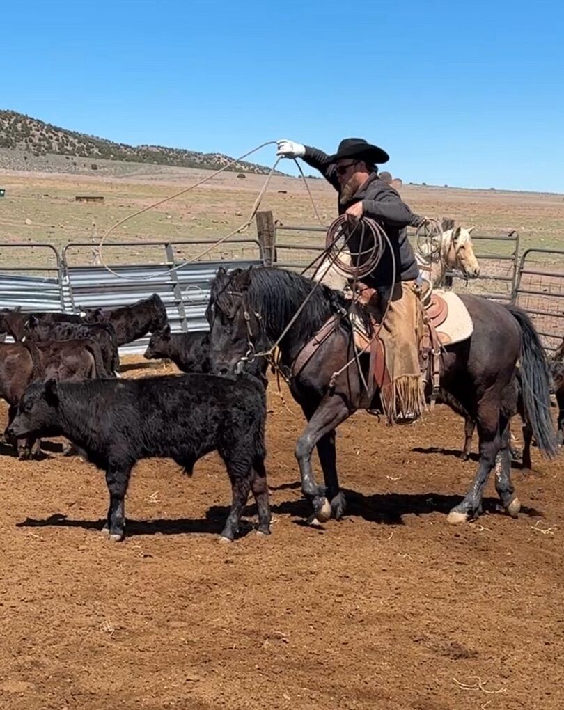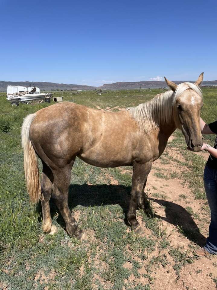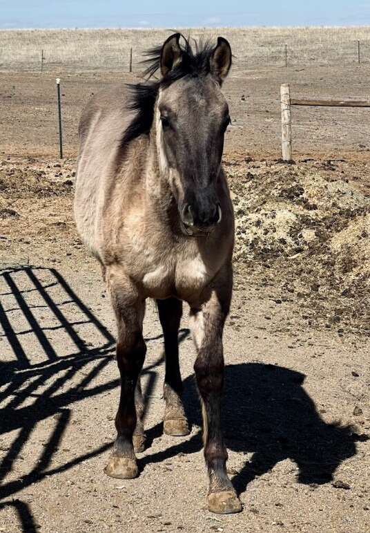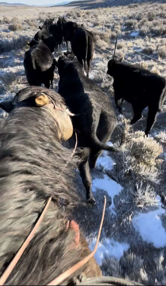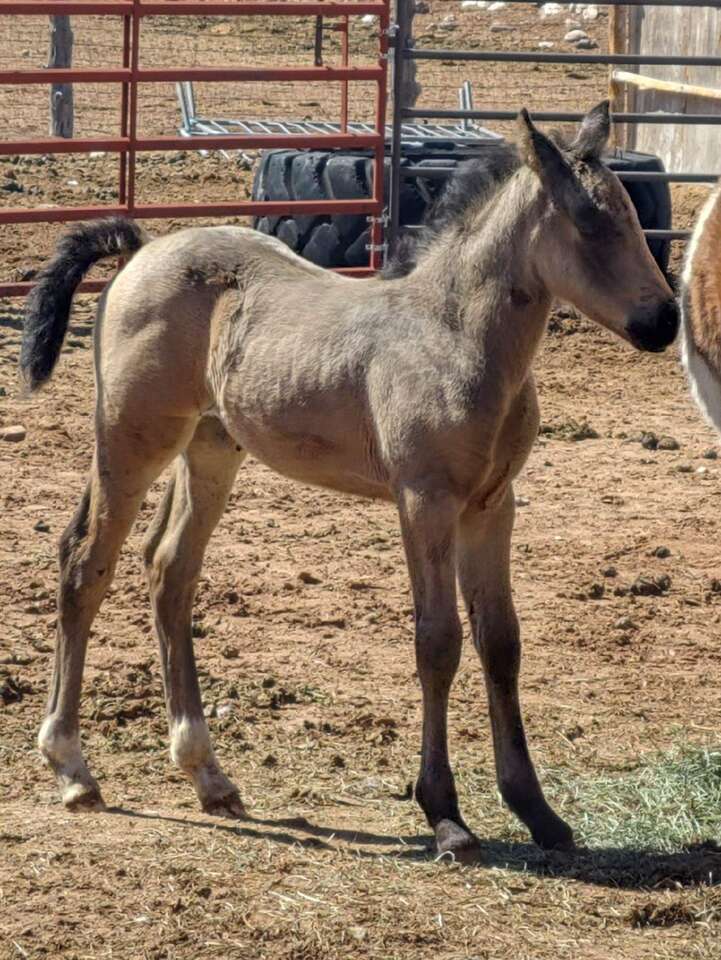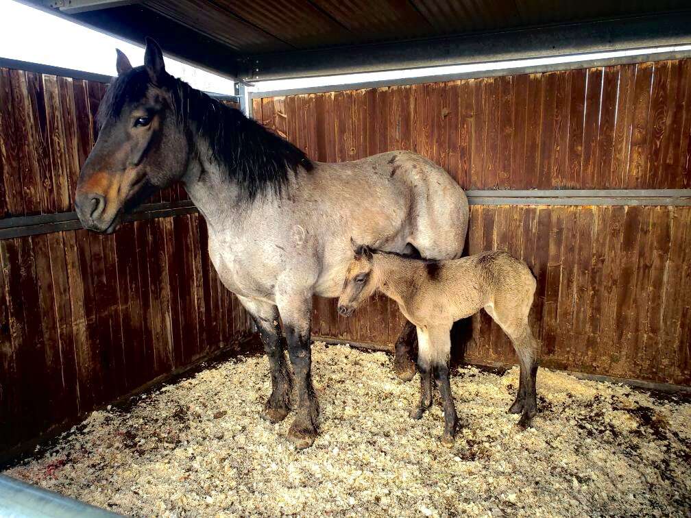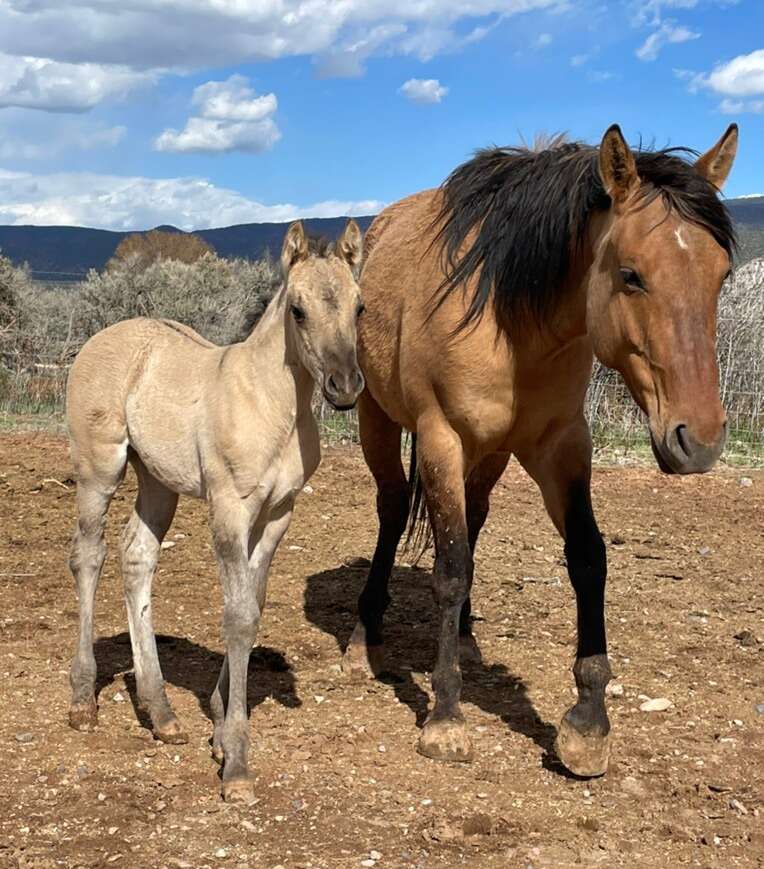 Doc is a buckskin half draft, he is 1/2 Percheron 1/2 quarter horse, he stands at 16 hands and is over 1500lbs(last we checked) and wears a #4 shoe! We’ve used him in all a aspects of ranch work! He’s super cowy and very athletic, along with a great disposition that he passes onto his foals! We have roped bulls, cows, doctored calves and brand calves on him every year! We have packed deer, elk and salt with no problems! We trailer him next to geldings and mares, as well as working all day long next to them with no issues! My wife rode him all winter while she was pregnant, and my son has rode him with me since he was 3 months old! He adds bone and the perfect amount of size to his foals! Videos of him working upon request! Sorrel is one of Doc’s coming 3 yr olds I started last year! The black is another one of Doc’s 2 year olds they are both doing great!