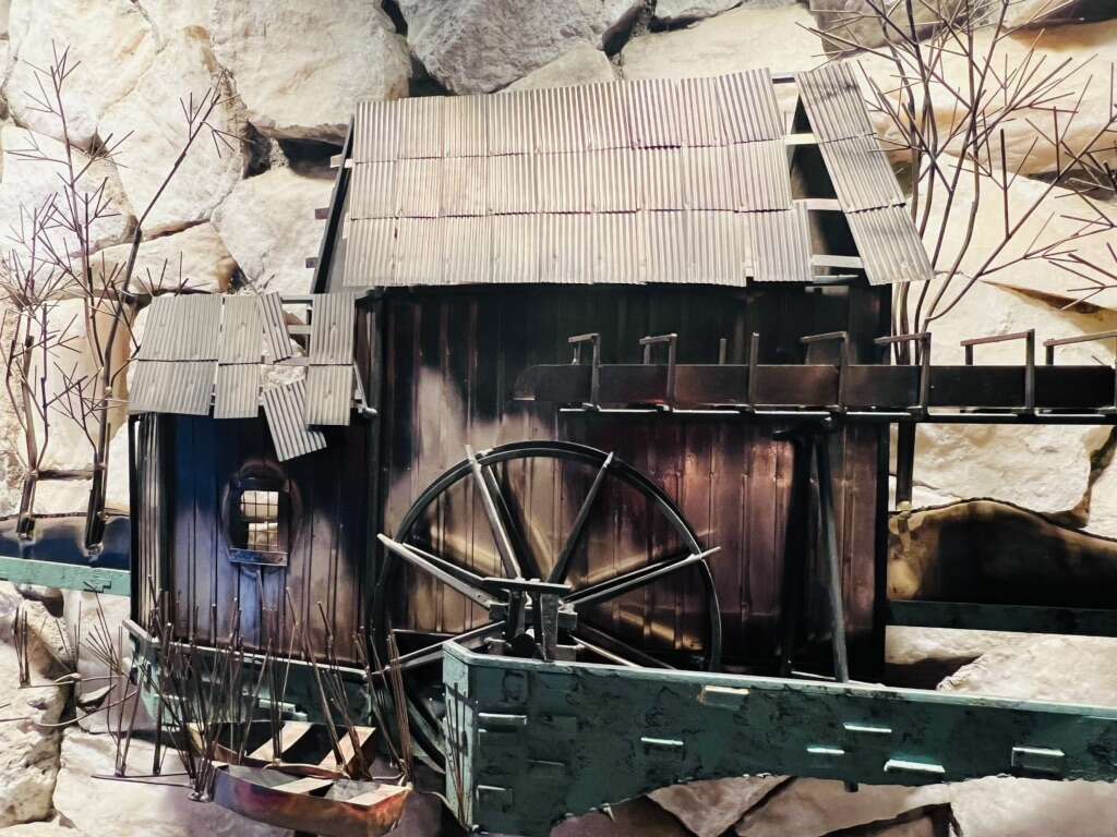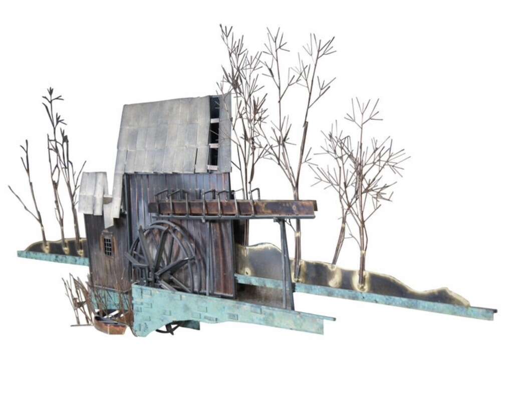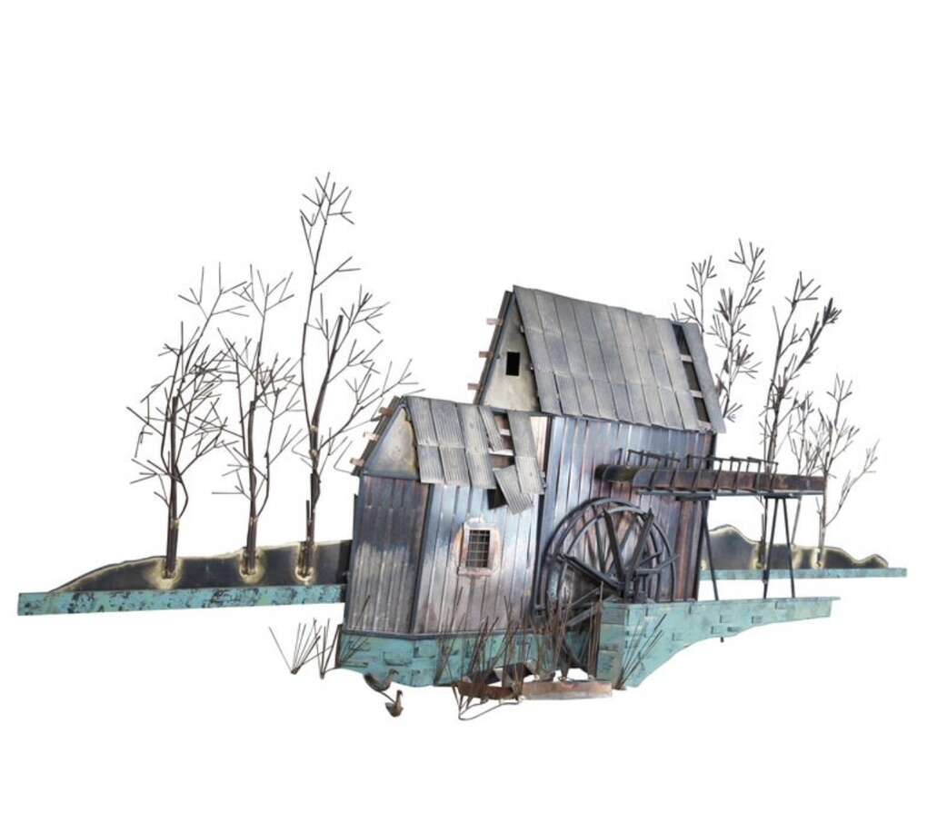 This is a original signed 1970s Curtis Jere Brutalist Metal Mill Farmhouse Water Wheel Wall Art Sculpture in great shape.
