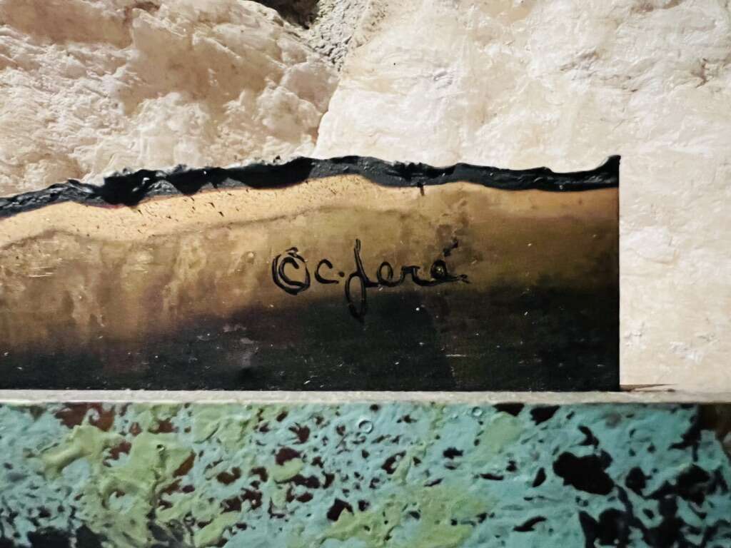 1970s Mid-century Curtis Jere brutalist style wall art sculpture. Made of copper, brass and steel featuring a primitive country or farmhouse landscape scene along a river complete with mill house, barn and water wheel. C. Jeré (or Curtis Jeré, often seen without the accent) is a metalwork company known for wall sculptures and household accessories. C. Jeré works range from representational to highly abstract, and are made and marketed by the corporation Artisan House. Curtis Jeré is a compound nom de plume of founding artists Curtis Freiler and Jerry Fels, who combined parts of their own names to create the C. Jeré signature. According to Modernism magazine, which interviewed Jerry Fels shortly before his death in October 2008, the company was founded in 1963 by Fels and his brother-in-law Curtis (Kurt) Freiler. Freiler was the production chief and Fels was head of design. Their goal was to produce gallery-quality art for the masses.[1] Prior to the establishment of Artisan House, the partners built a costume jewelry business, selling work under the names Renoir and Matisse, which employed around 300 people at one point.[2] Kurt and Jerry sold Artisan House in 1972. Kurt Freiler died July 22, 2013 at the age of 103.[3] In a two-page article on the history of C. Jeré for the November 2010 issue of Elle Decor, Mitchell Owens wrote that, after launching in 1964, C. Jeré sculptures were distributed by Raymor, a cutting edge studio in New York City, and retailed at Gump's in San Francisco and other high quality emporiums…Under Freiler's meticulous direction, the workers—a number of whom were minorities or handicapped—sheared, crimped, torched, and welded brass, copper, and other metals before coating them with luminous patinas…Today those pieces are attracting the admiration of leading dealers in vintage chic.[4] Sold and resold, the company still produces metal sculptures including reintroductions of popular mid-century modern designs. Artisan House sculptures are no longer made in California. Production went overseas to China in 2003. Some of the older techniques, such as enameling, using resin, and the bronzes, haven't been used in decades. Weighs approximately 30 lbs.