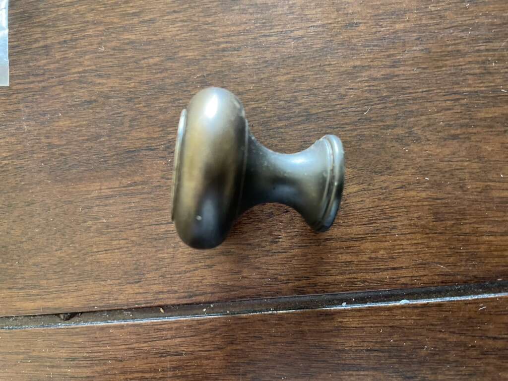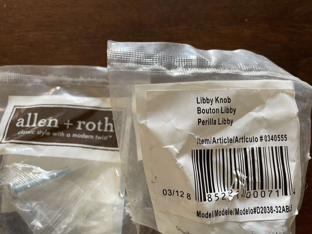 I have 2 new oil rubbed bronze cabinet or drawer knobs by Allen & Roth. The packaging says Libby Knobs. They are 1 1/4 inches across. $2 for the pair. See my other ads for jewelry, artwork, home decor and more.
