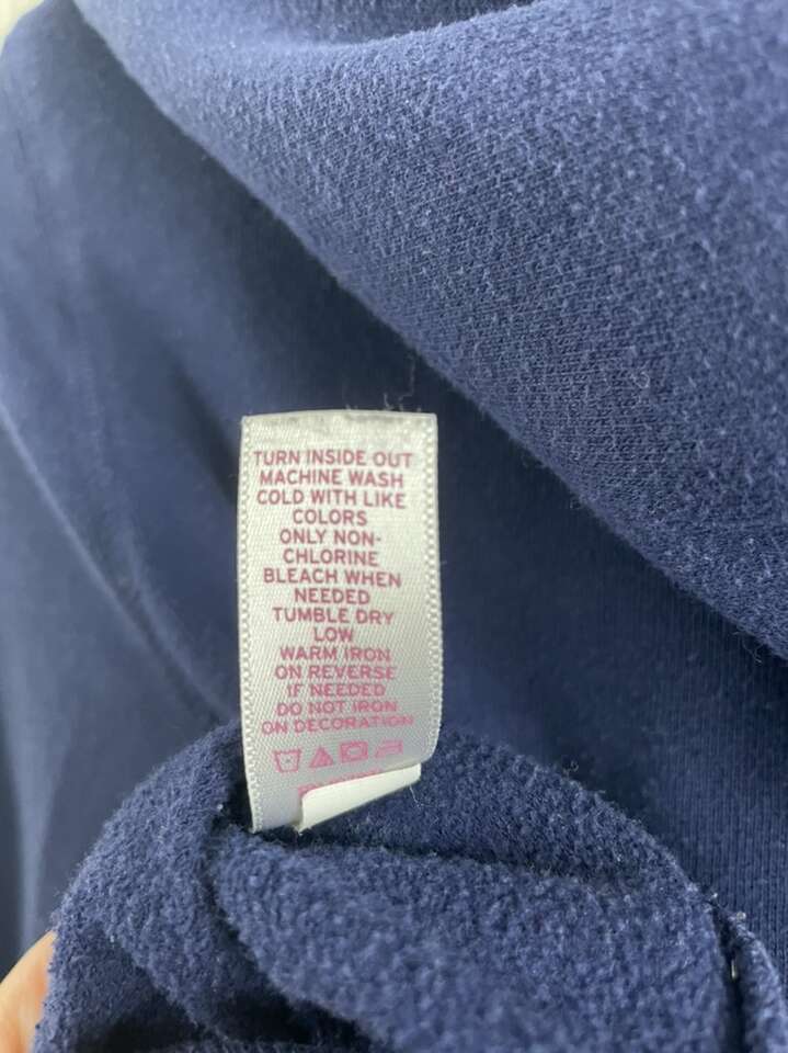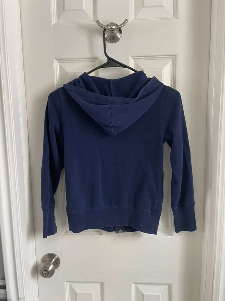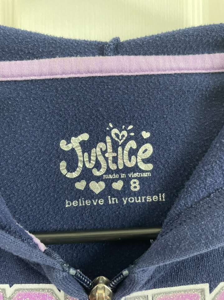 Girls Justice hoodie size 8. Navy blue with purple glittery letters and sequins. Zip front with cute heart pull tab charm. Thumb holes and front hand muff pocket.