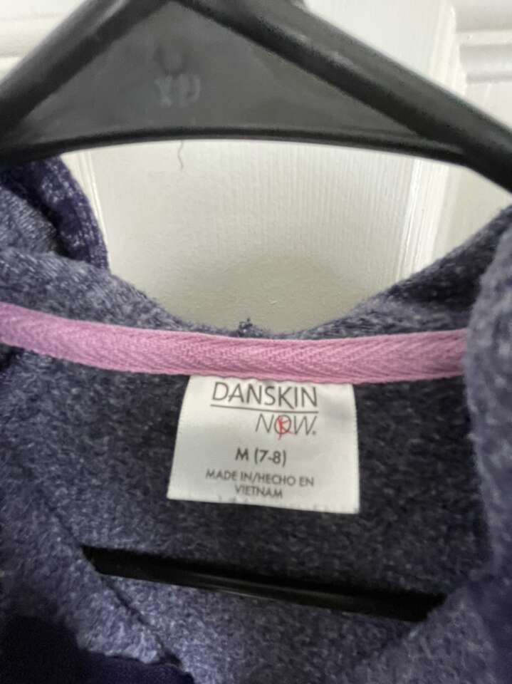 Girls Danskin hoodie in a size 7/8 (medium). It’s a blue/purple with the words “ATHL DEPT Varsity EST. 54” on the front. It has a partial zipper on the front.