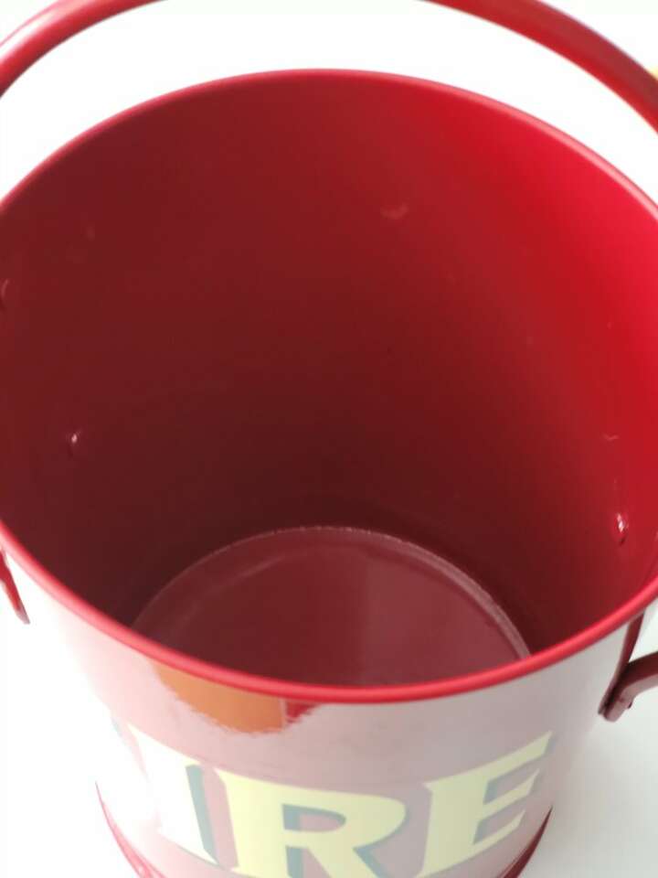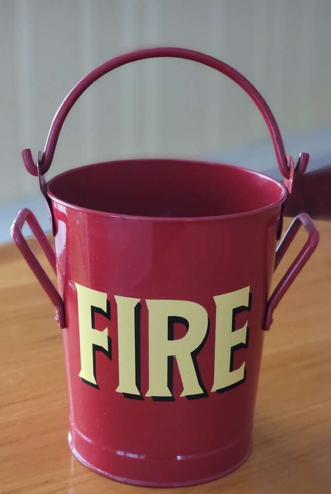 Vintage Anthropologie tin fire bucket. Glossy red and yellow paint. In great condition - no chips or scratches. Measures 9"H x 7"W. Height with handle extended is 13". This makes a great kitchen or countertop catch-all container. Cash only. No codes or scammers please.