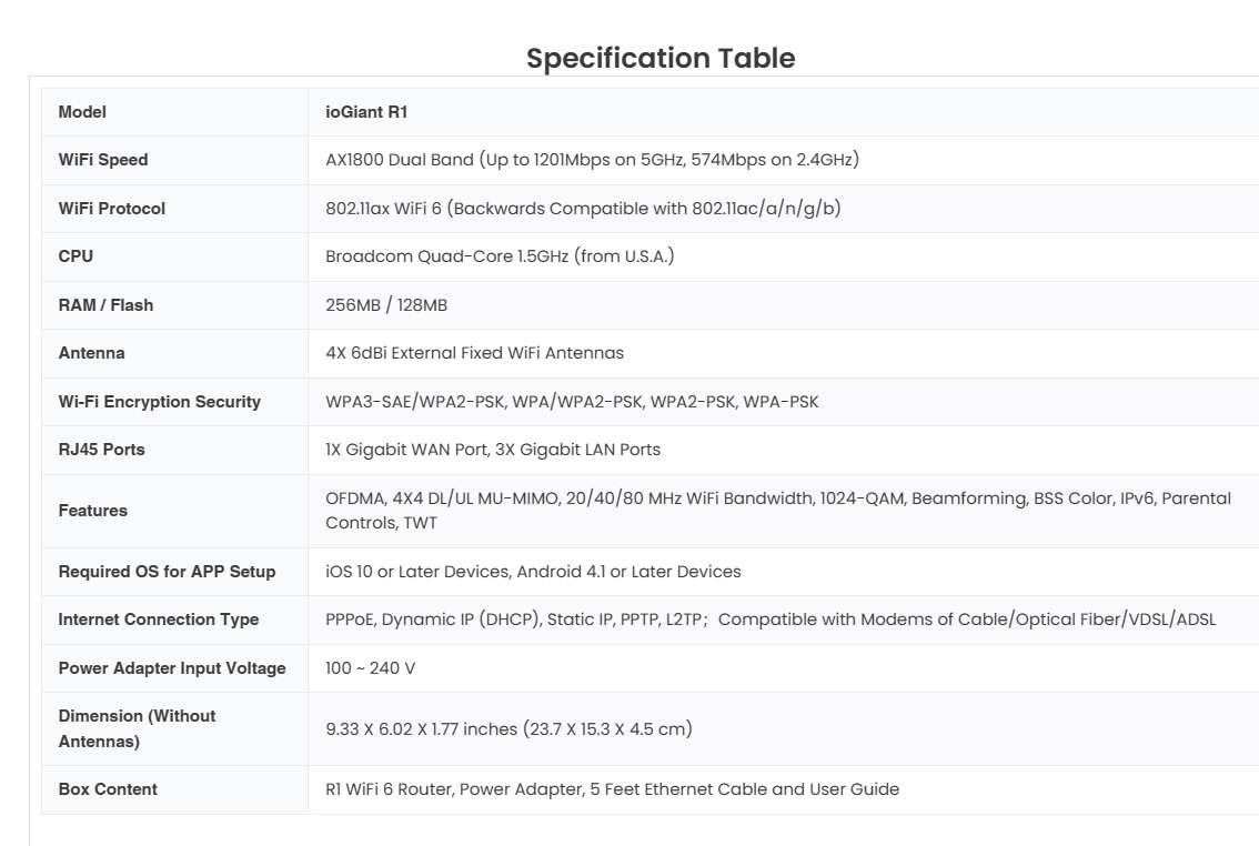 Supreme WiFi Experience: AX1800 WiFi router brings 1.5x speed, 1.5x range and 4x capacity for home network. Work with any broadband 1800Mbps WiFi 6 router: Dual band Wi-Fi (1201Mbps on 5GHz and 574Mbps on 2.4GHz) boosted by Broadcom quad-core 1.5GHz CPU. Buffer-free for 4K video streaming, gaming, and working from home Cover Whole Home WiFi: 4 high-gain antennas and 2 power amplifiers deliver strong WiFi signal everywhere in your house. Say goodbye to weak signal with this wireless router More Devices Less Congestions: With OFDMA and MU-MIMO technology, the routers for wireless Internet let you connect up to 64 WiFi devices at same time App Easy Setup: ioGiant WiFi App walks you through setup in minutes and gives you a full management for WiFi