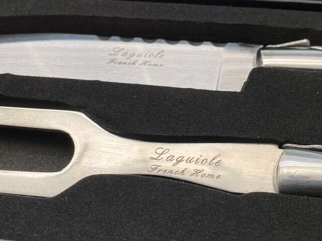 Carve your delicious roasts with French Home's stainless steel Laguiole carving set. The curved handle, offering a comfortable grip, and the iconic bee emblem signify the traditional French Laguiole design. Whether carving in the kitchen or at the festive holiday table this knife and fork carving set adds elegance to the dining experience. An attractive box is perfect for storage and gift giving. Laguiole is a town in southern France where this style originated in the 1820's.