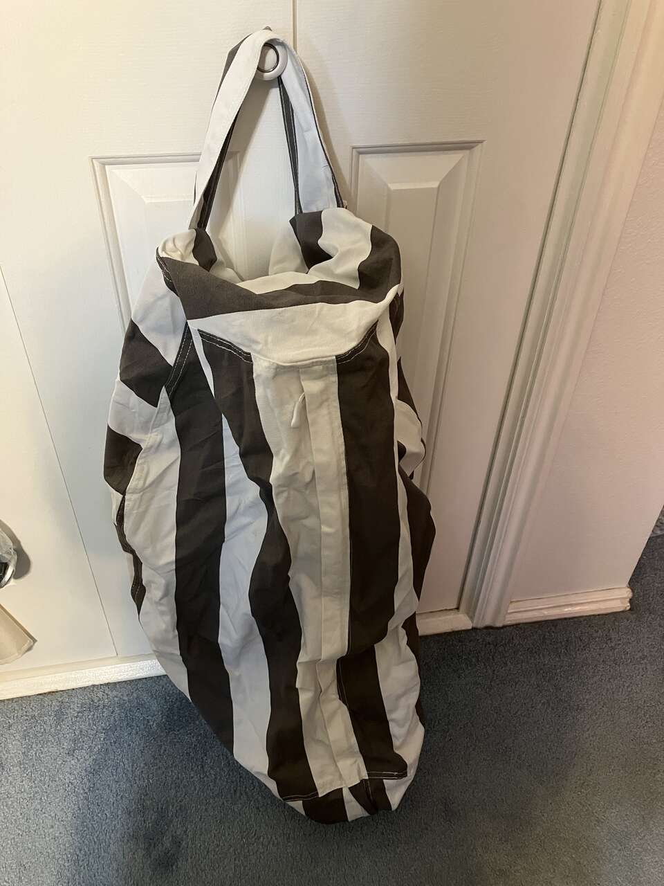 Venmo3 NEW BREATHABLE 100% LINEN CANVAS STORAGE ZIPPERED DUFFLE BAGS. These 3 Gray & White Stripped bags have a Heavy-Duty Zipper that goes the Full Length from Top to Bottom AND then continues across the bottom Diameter. Makes loading and unloading a cinch. Easy Machine Wash/Dry. By CreativeQT Brand. 22" wide, 26" tall (not including carry handle) and 14" diameter. Currently comparable online bags running $38 each. Only $18 each or all 3 for $45. See all 7 Photos for New Condition. Cash/Venmo. In Sandy. 801-201-5350. Can hold 8 basketballs or soccer balls or baseball bats, mits, helmets and baseball, or 10 Volleyballs. Every Coach needs these.