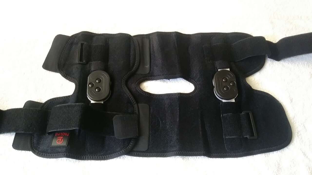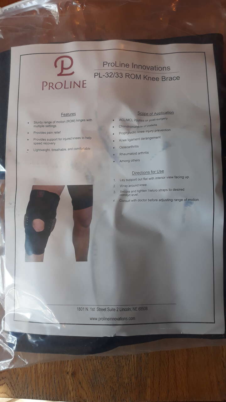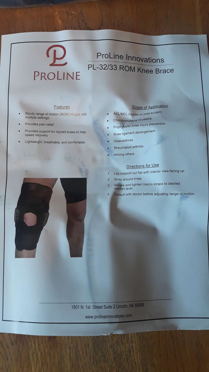 Proline Innovations PL-32/33 Knee Brace with Sturdy Range of Motion (ROM) Hinges with multiple settings. Provides pain relief and is lightweight, breathable and comfortable. Velcro straps for adjustability- See pictures for how pieces attach.