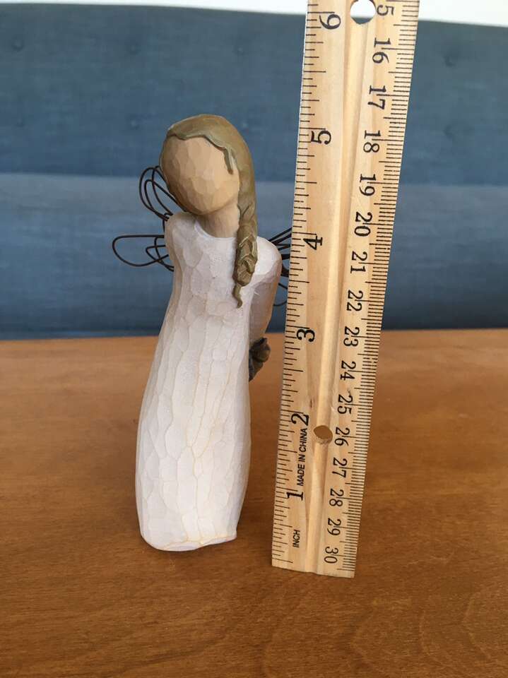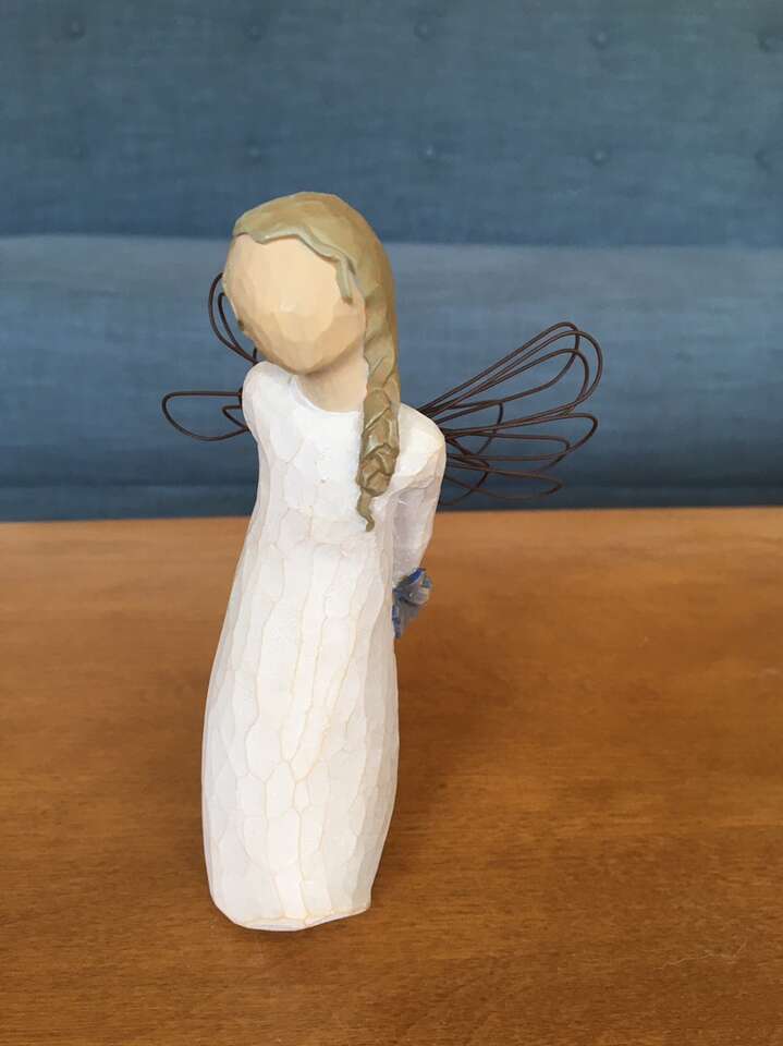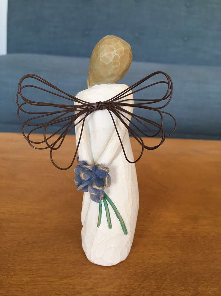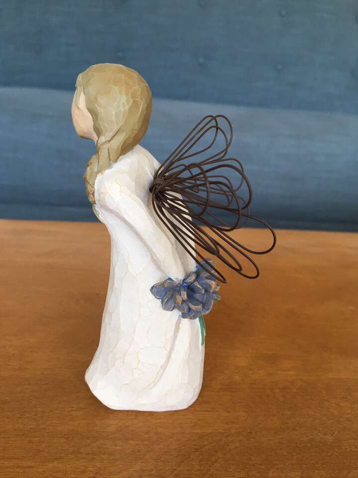 Willow Tree “Thank You” DEMDACO collectible figure, by Susan Lordi, 2002. Standing angel, light brown braided hair, wire wings, holding blue flowers behind her back. Hand-painted resin, 5.5” tall, excellent condition. Text only. Cash or Venmo.
