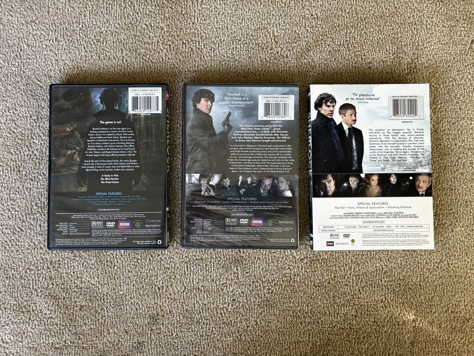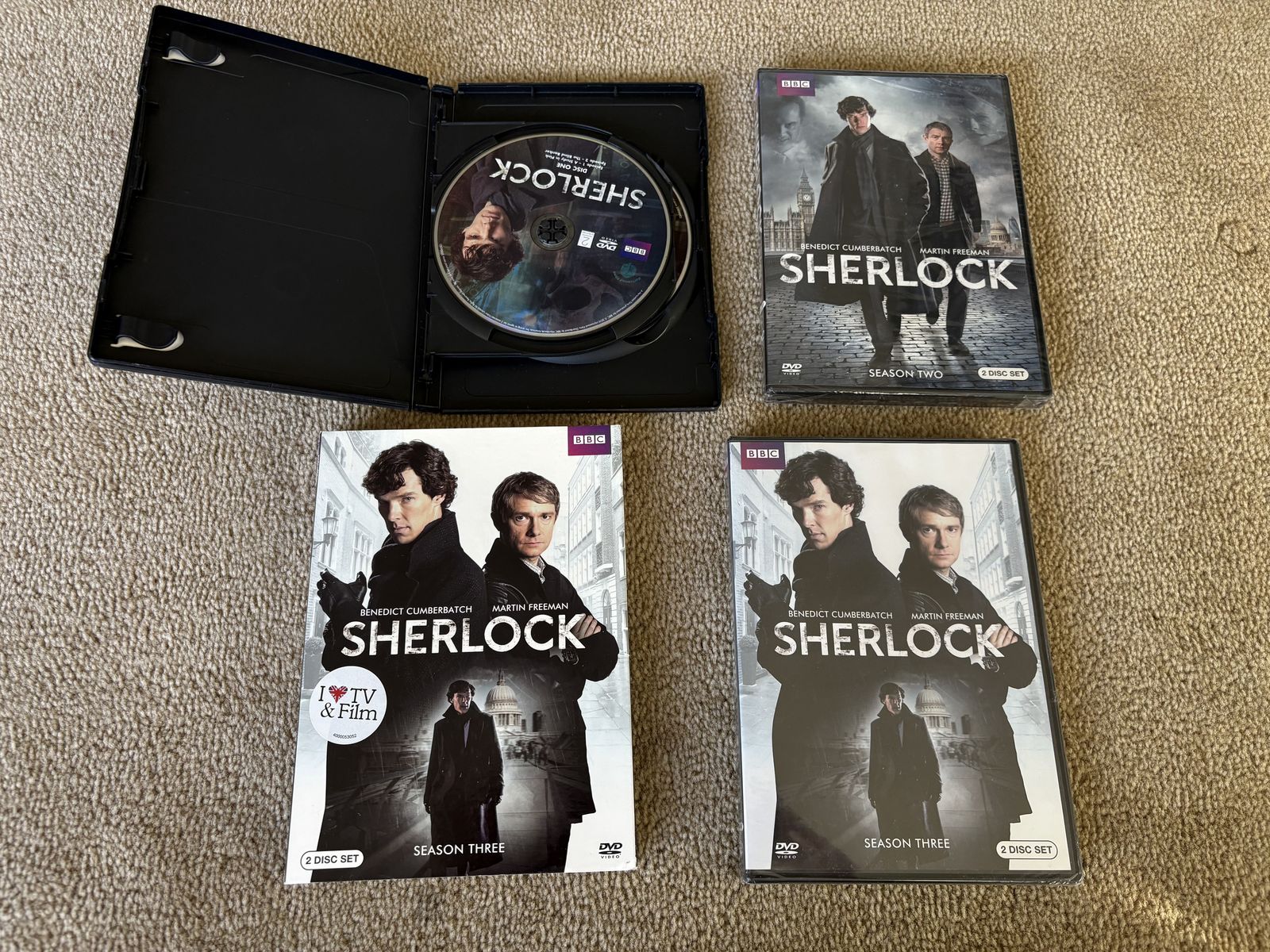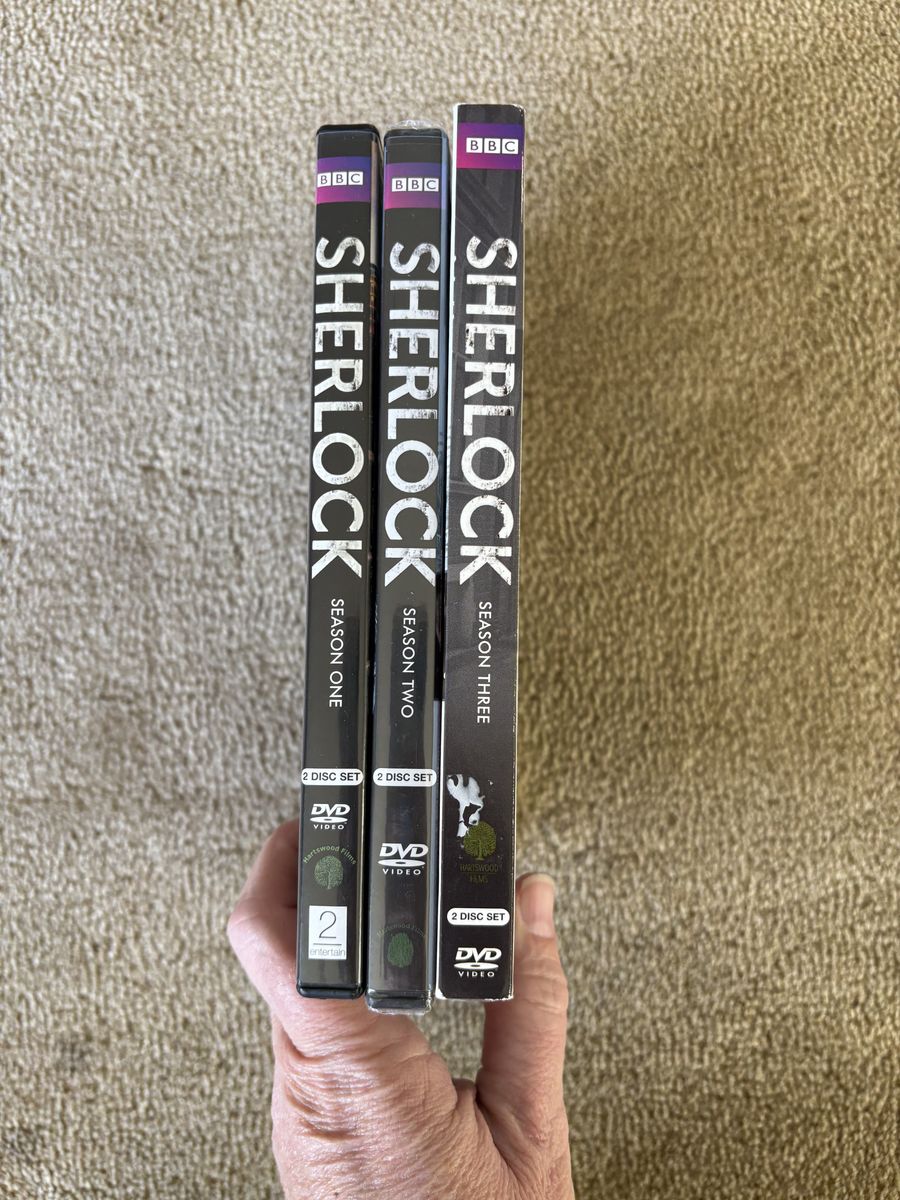 BBC Sherlock DVDs, Seasons 1, 2, & 3. Starring Benedict Cumberbatch and Martin Freeman. Two discs per season, six discs in all. Seasons 2 & 3 NEW (sealed in plastic). All other discs in excellent condition, no scratches. Text only. Cash or Venmo. Discount on multiple items.