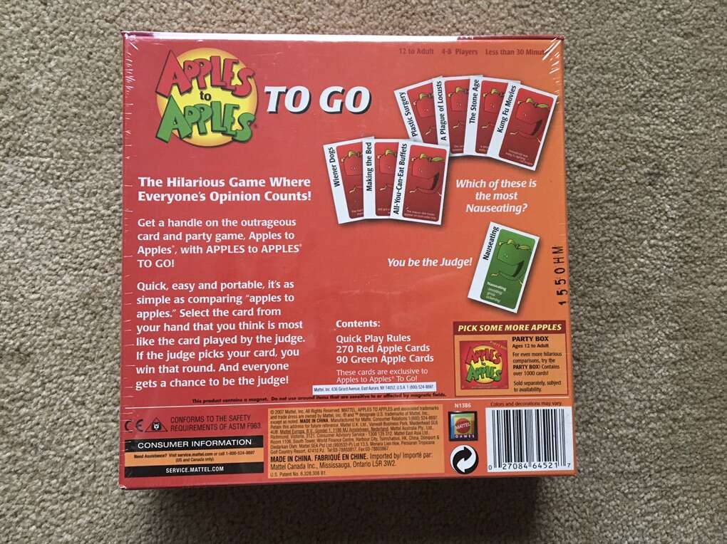 NEW (sealed in plastic) Apples to Apples: To Go. The game of hilarious comparisons! A portable, quick-play, travel version of the fun family game. 4-8 players. Ages 12+. 2007. Text only. Cash or Venmo.
