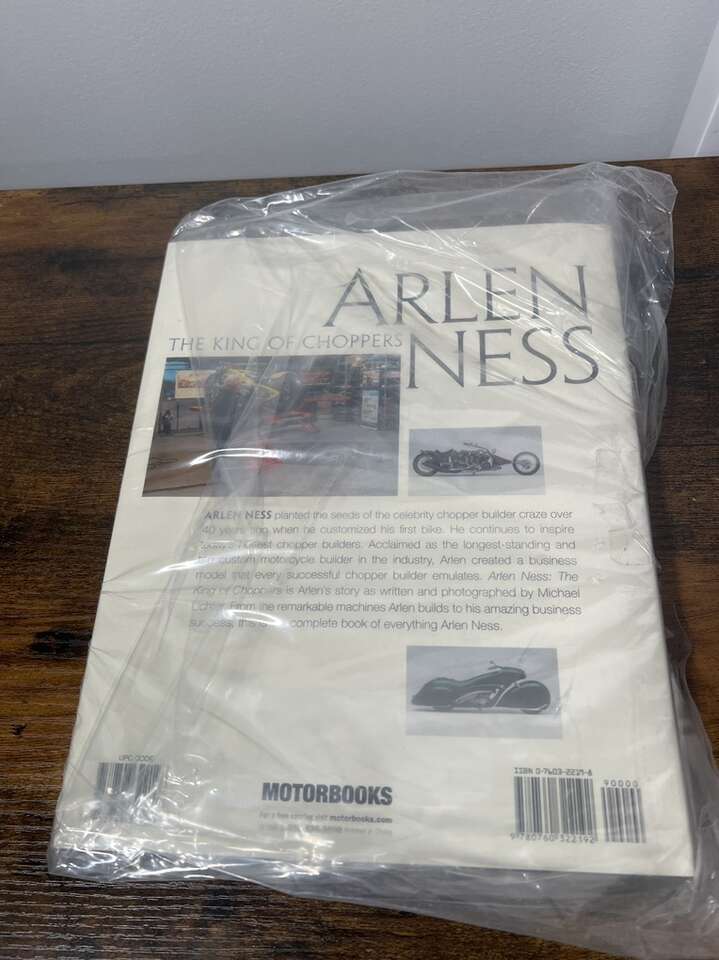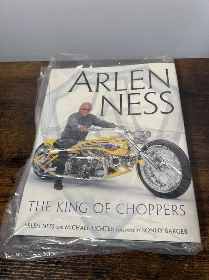 For your consideration is a new copy of Arlen Ness book The King Of Choppers. It is signed on the first page by Arlen Ness & his son Cory Ness in 2017. It States best wishes, not to a particular person. This was won at a fundraiser and never pulled out of there plastic until today. I only opened the book to thee first page to get a picture of the signature. It has otherwise been safe on a book shelf. Never opened past the signature page. Book is in perfect condition, no dinged corners. When they're available on ebay, signed copies by Arlen alone made out to somebody (not likely your name) start at $250. That's where I'll start. I will not remove the book to show the autograph unless you are here with cash intending to buy.