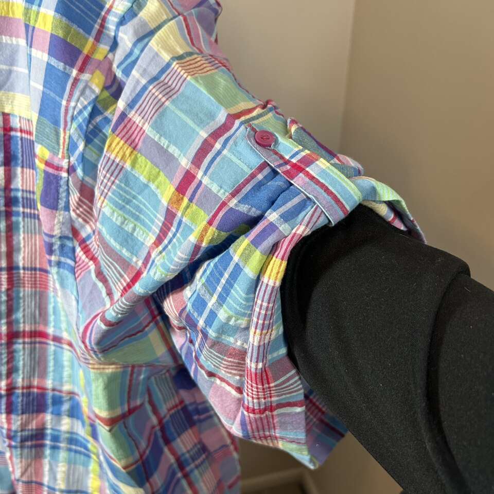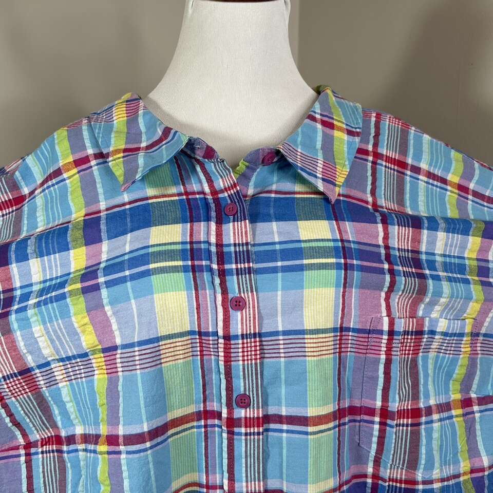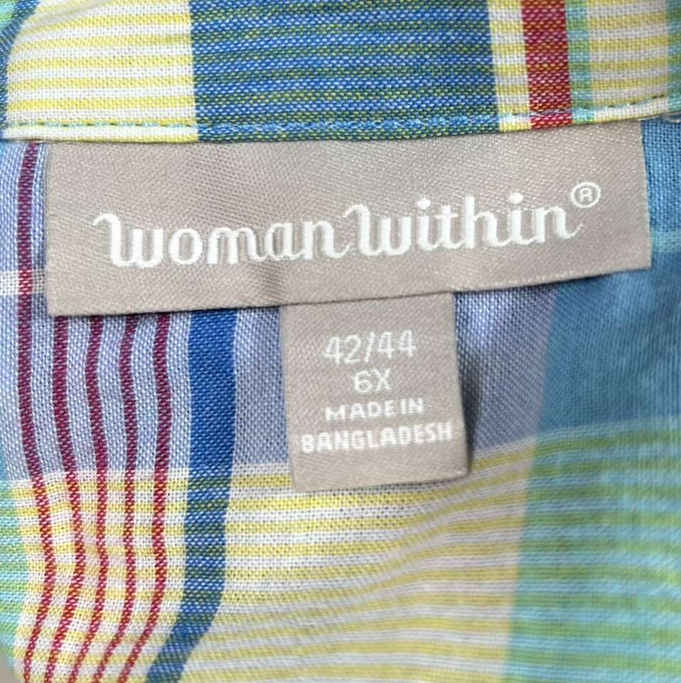 Gently used: Size 6X Like New - 100% Comfortable Cotton SHIRT . Pattern is Plaid: Summery Bright blue, red, yellow, etc. Quality Brand: Woman Within. \