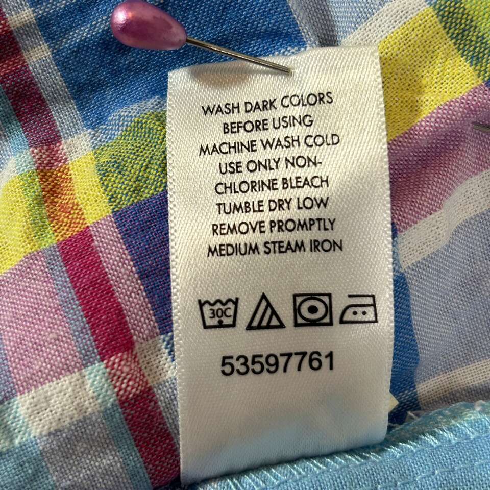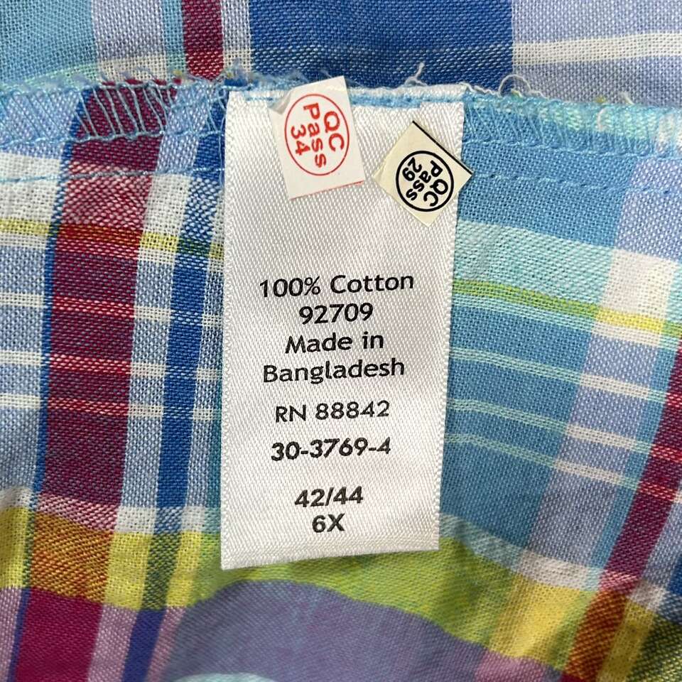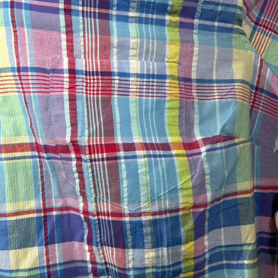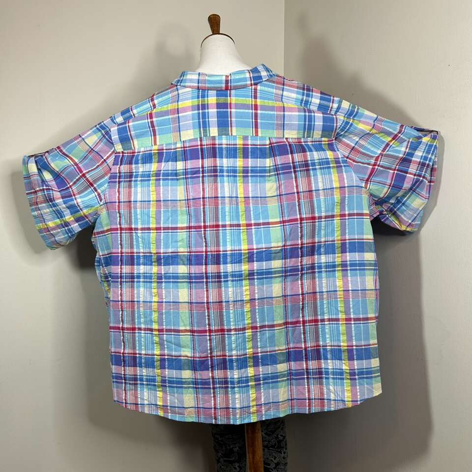 Gently used: Size 6X Like New - 100% Comfortable Cotton SHIRT . Pattern is Plaid: Summery Bright blue, red, yellow, etc. Quality Brand: Woman Within. \
