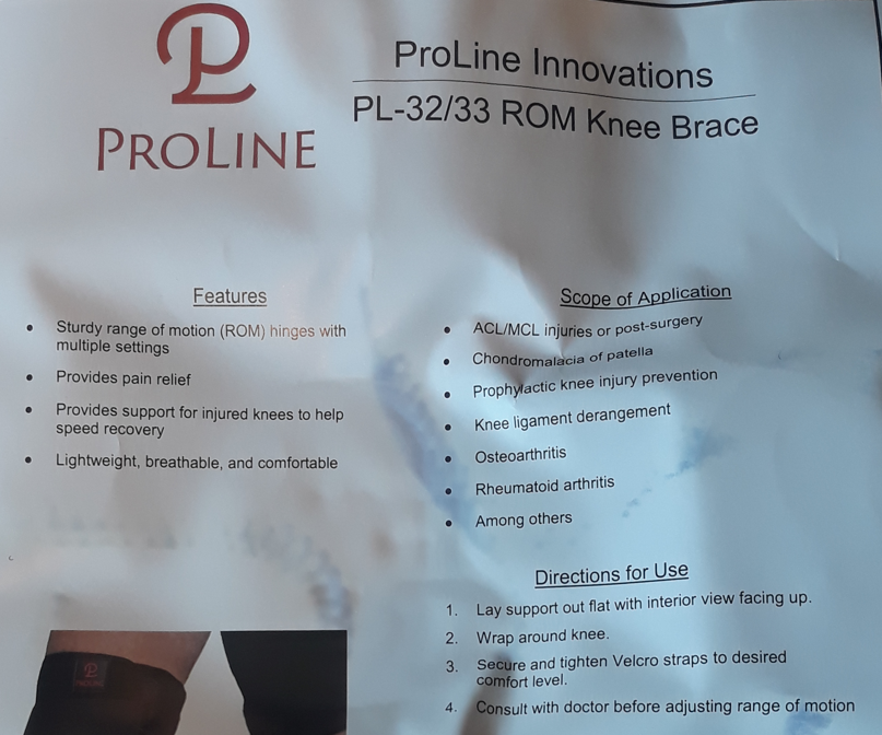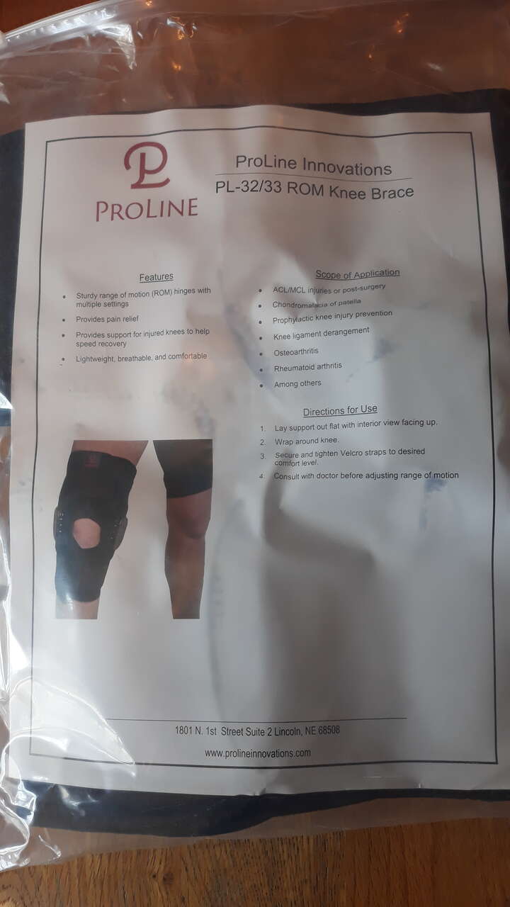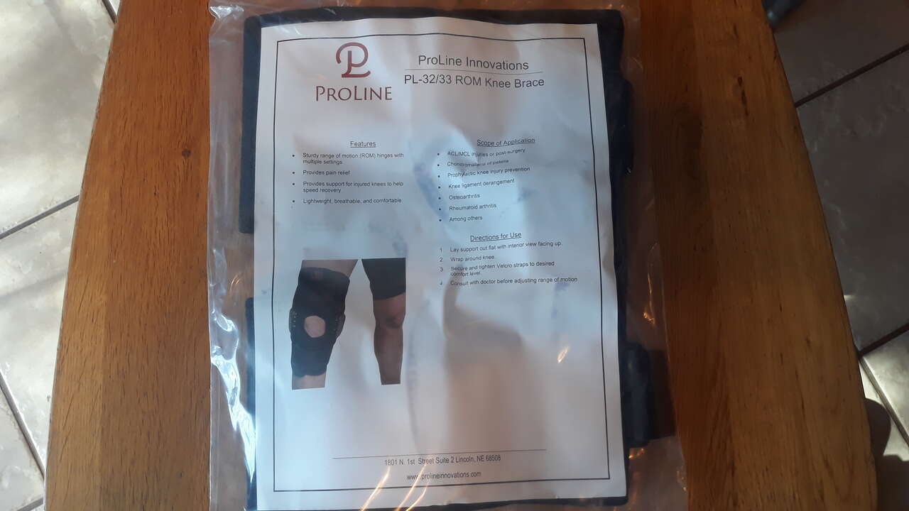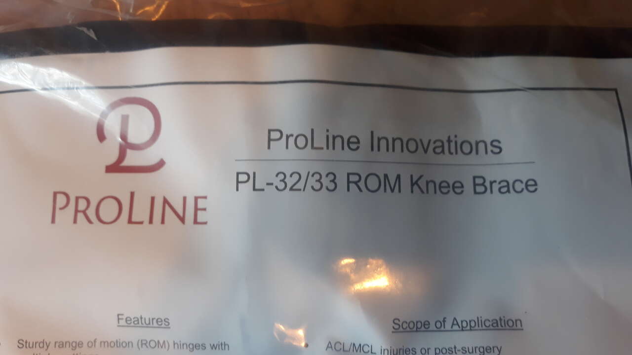 Proline Innovations PL-32/33 Knee Brace with Sturdy Range of Motion (ROM) Hinges with multiple settings. Provides pain relief and is lightweight, breathable and comfortable. Velcro straps for adjustability- See pictures for how pieces attach.