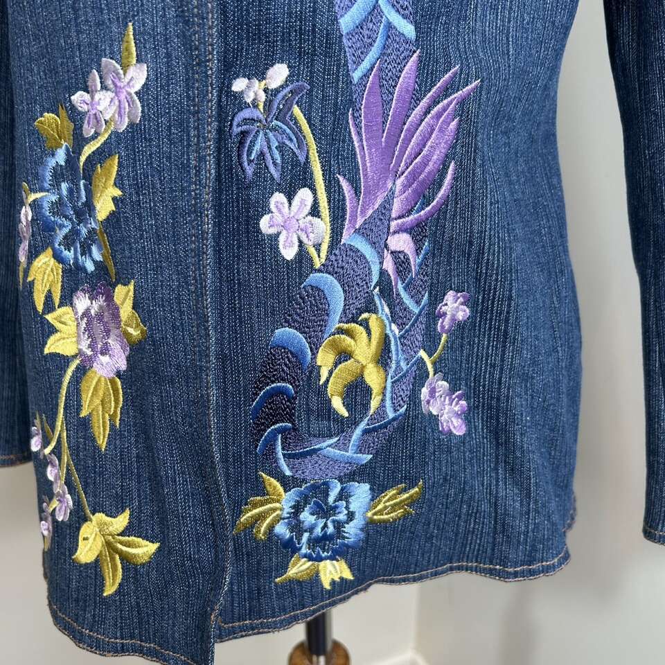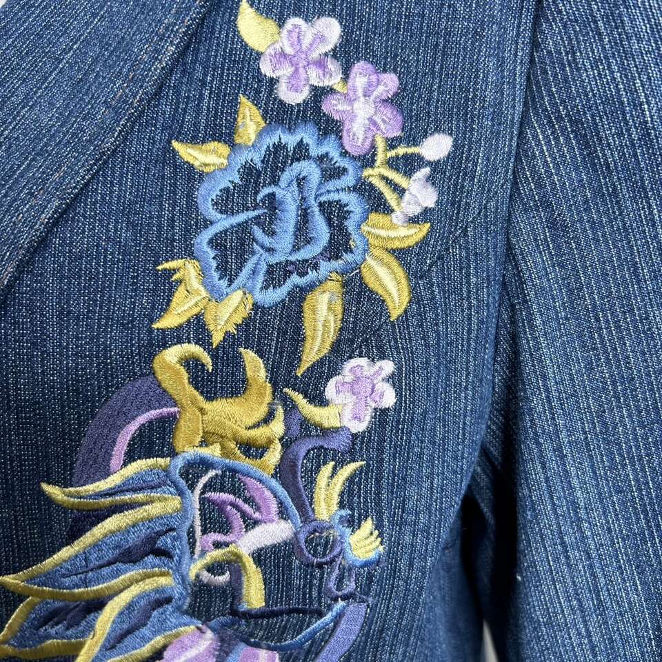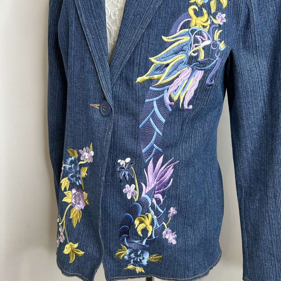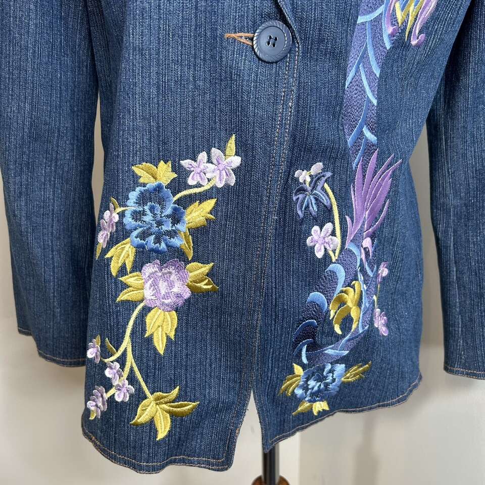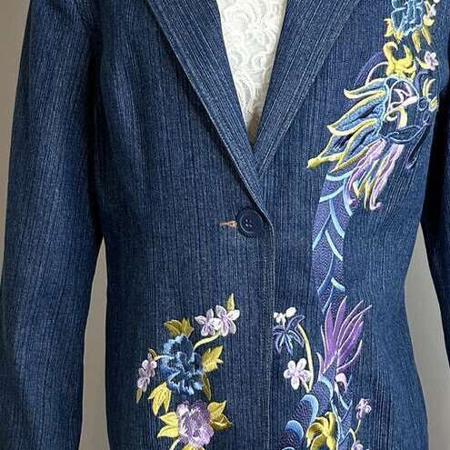 Nearly NEW -Gently used Denim JACKET with Embroidered Oriental Dragon & colorful Flowers. Single button closure, closed back. Measurements: Labeled Size Medium Length: 27” Pit2Pit: 21 Shoulder2Shoulder: 17” Waist: flat: 18.5”; Circumference: 37 Sleeve Length: 23” Hem Circumference: 42” Fabric Content: 98% Cotton, 2% Spandex Brand: Pamela McCoy . Has inside breast pocket- can hold a phone.