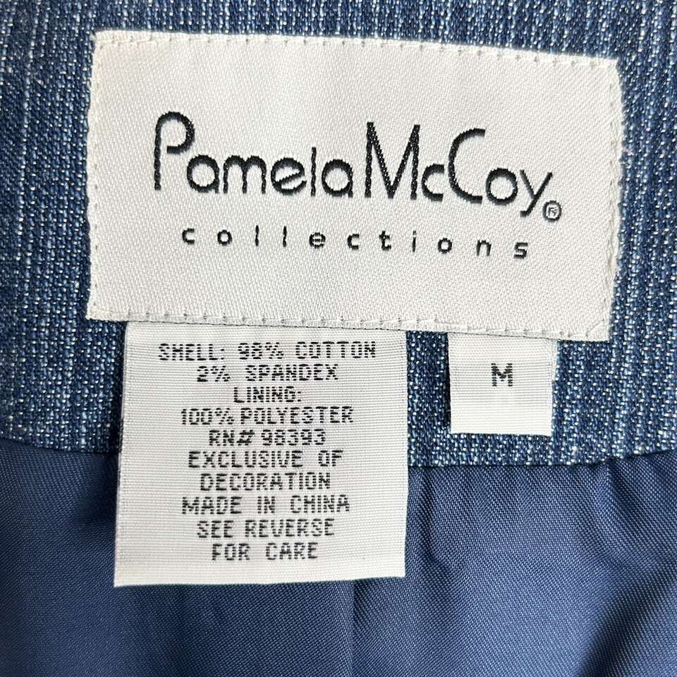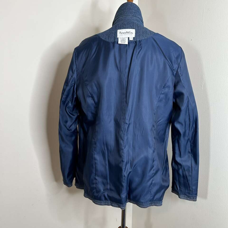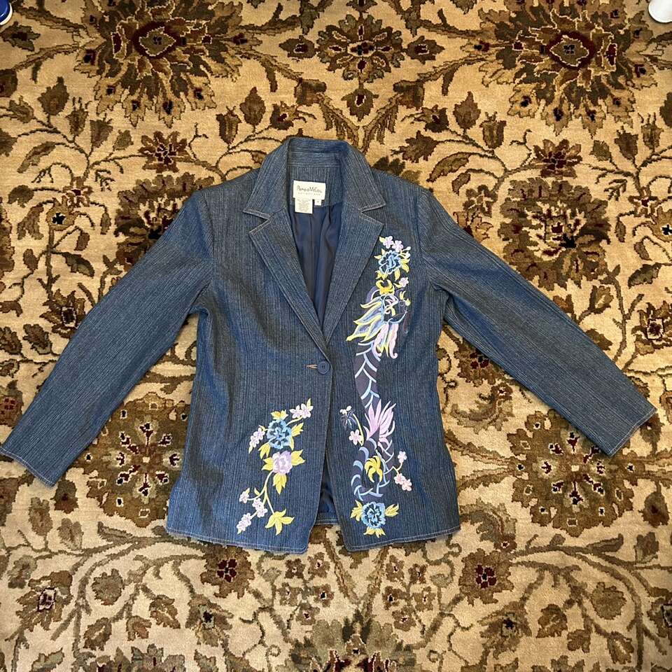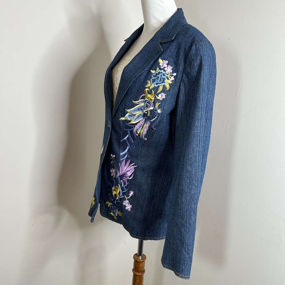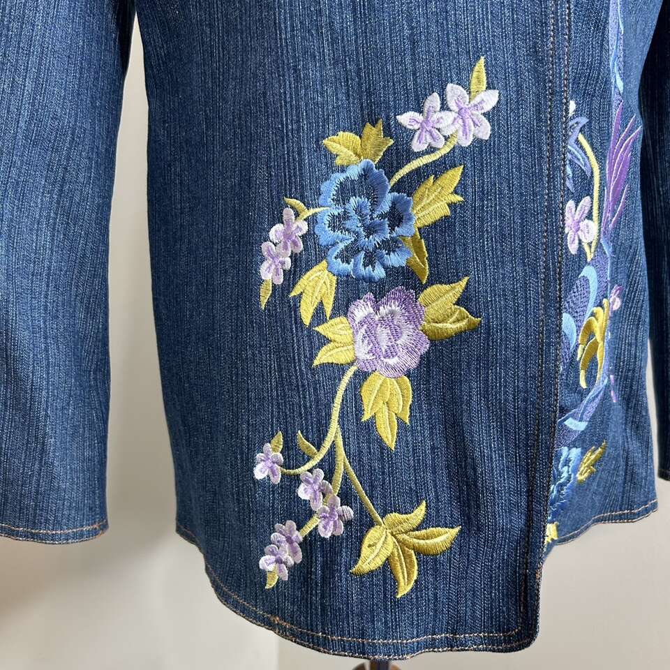 Nearly NEW -Gently used Denim JACKET with Embroidered Oriental Dragon & colorful Flowers. Single button closure, closed back. Measurements: Labeled Size Medium Length: 27” Pit2Pit: 21 Shoulder2Shoulder: 17” Waist: flat: 18.5”; Circumference: 37 Sleeve Length: 23” Hem Circumference: 42” Fabric Content: 98% Cotton, 2% Spandex Brand: Pamela McCoy . Has inside breast pocket- can hold a phone.