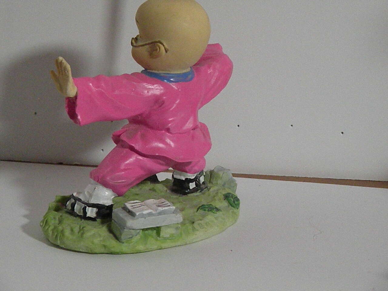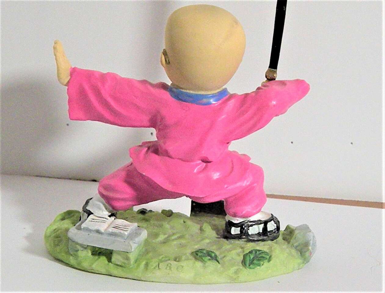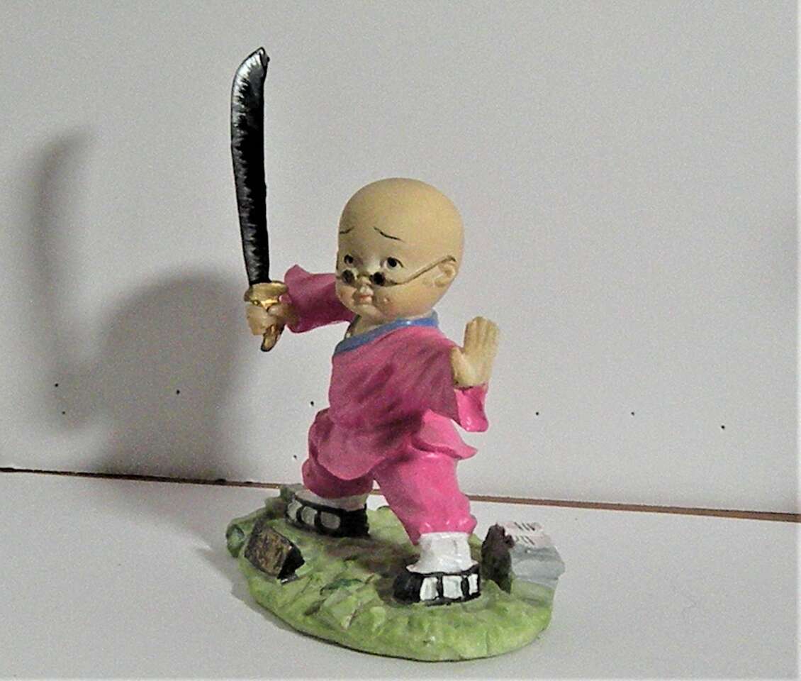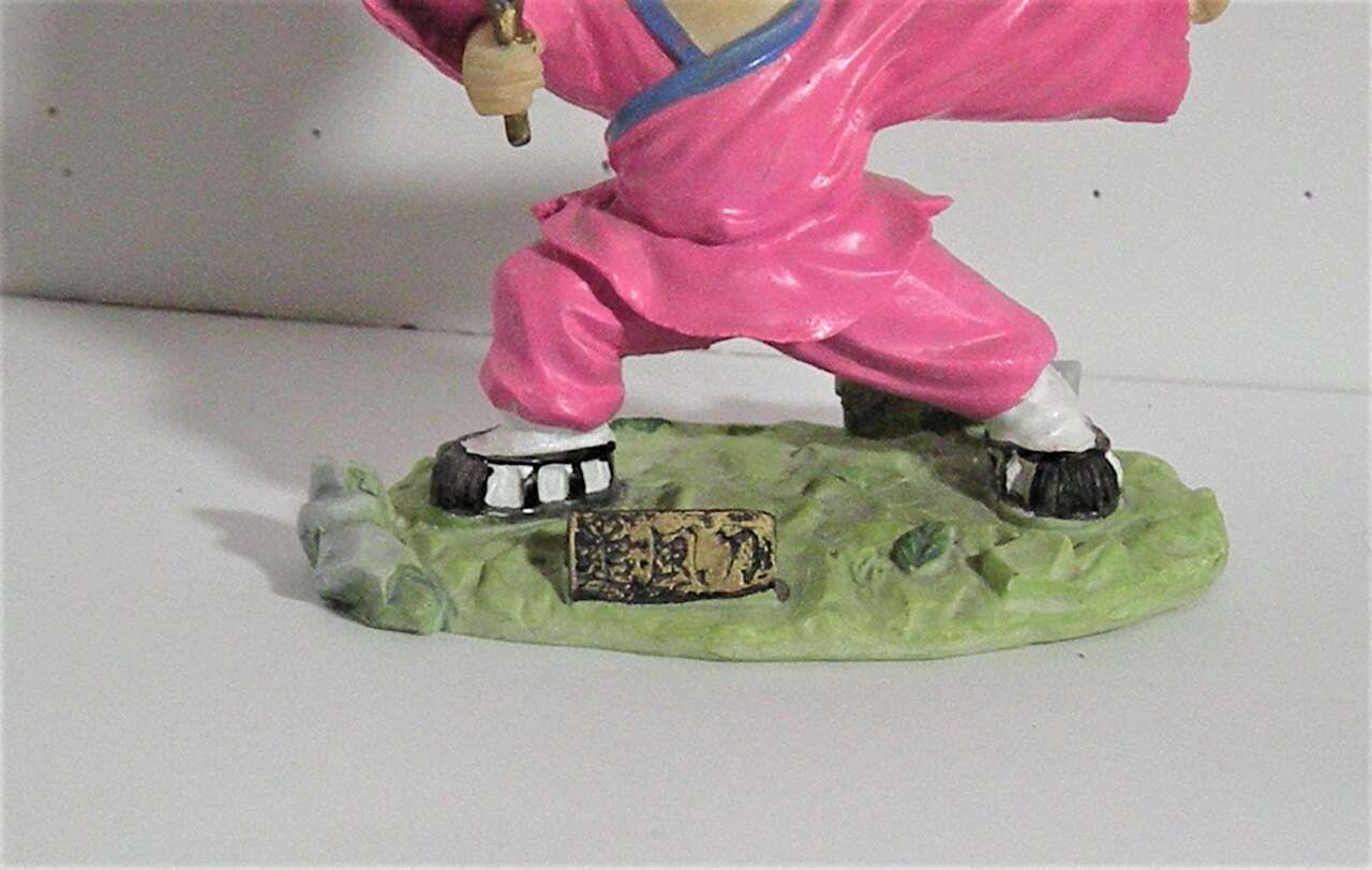Vintage Japanese Hakata Bisque Doll with Samuri Sword and Glasses. This unique figurine is a Japanese Male (possible child) in a middle stance with sword raised and hand out and feet apart. There is Japanese writing on the small plaque in the front. He is wearing a bright pink outfit with black and white shoes. he has a pair of glasses resting on his nose and wrapped around his ears. This is a very unique and intricately done figurine sculpture which would add toany collectionor a great gift for someone involved with sword fighting. It is in great condition for its age. There is a slight rubbing on the hand which seems to be a flaw when originally carved. I think they are madefrom clay. Hand painted and intricately detailed.