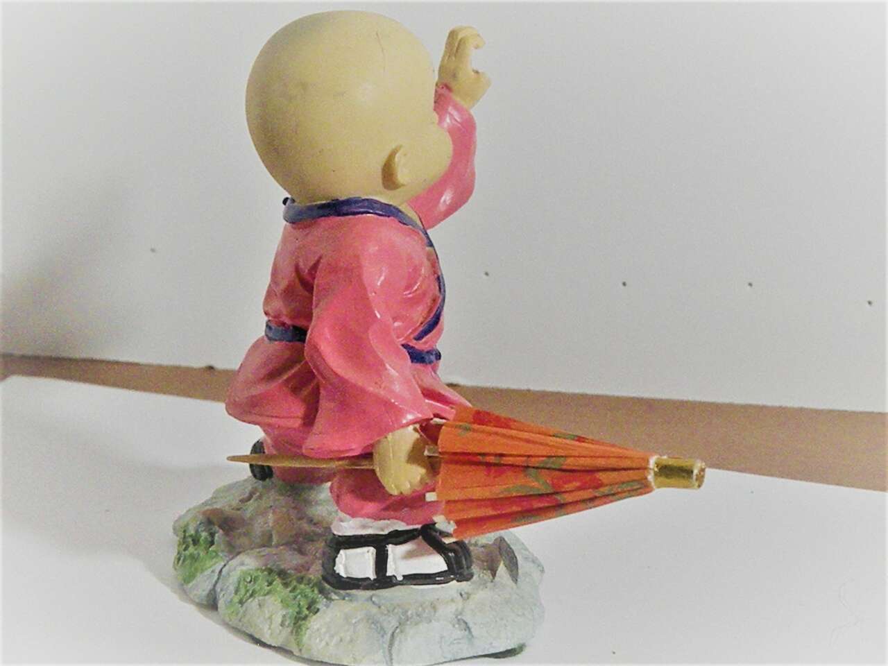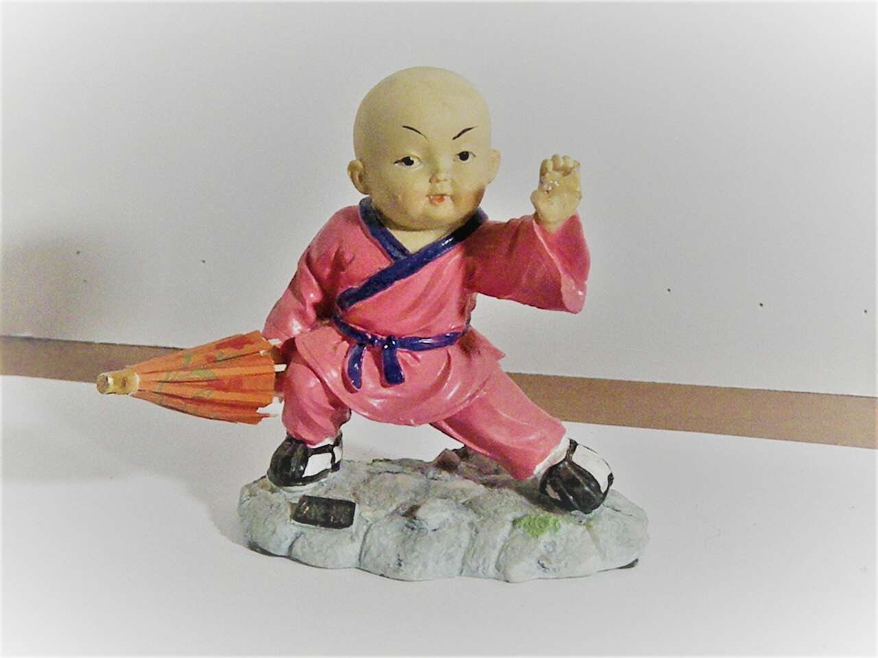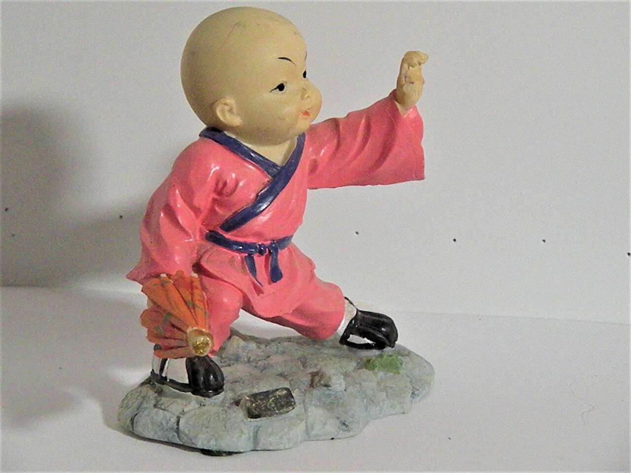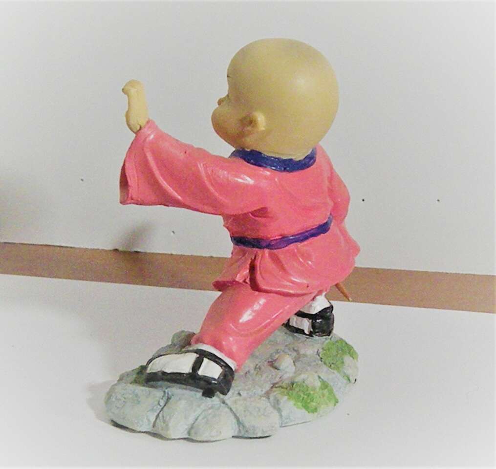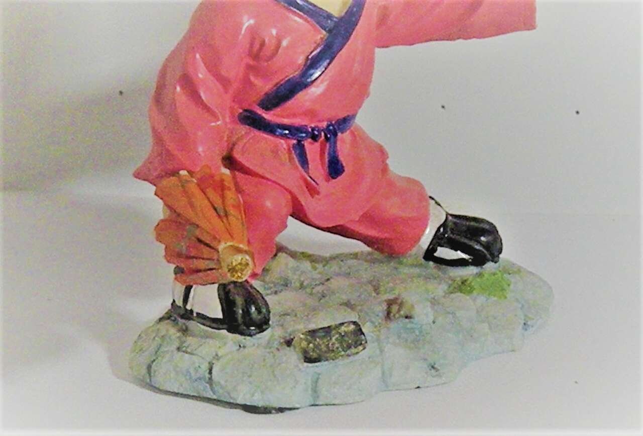 Vintage Japanese Hakata Bisque/Clay Doll in Martial Arts Stand with hands down by his side in cupping position and the other is outstretched and cupped. He wears a bright pink outfit with purple trim and belt. His shoes are black and white and there is a plaque in the front with Japanese wording. in very good condition has a thumb missing from left hand but does not distract from the uniqueness and intricate detail of the sculpture.