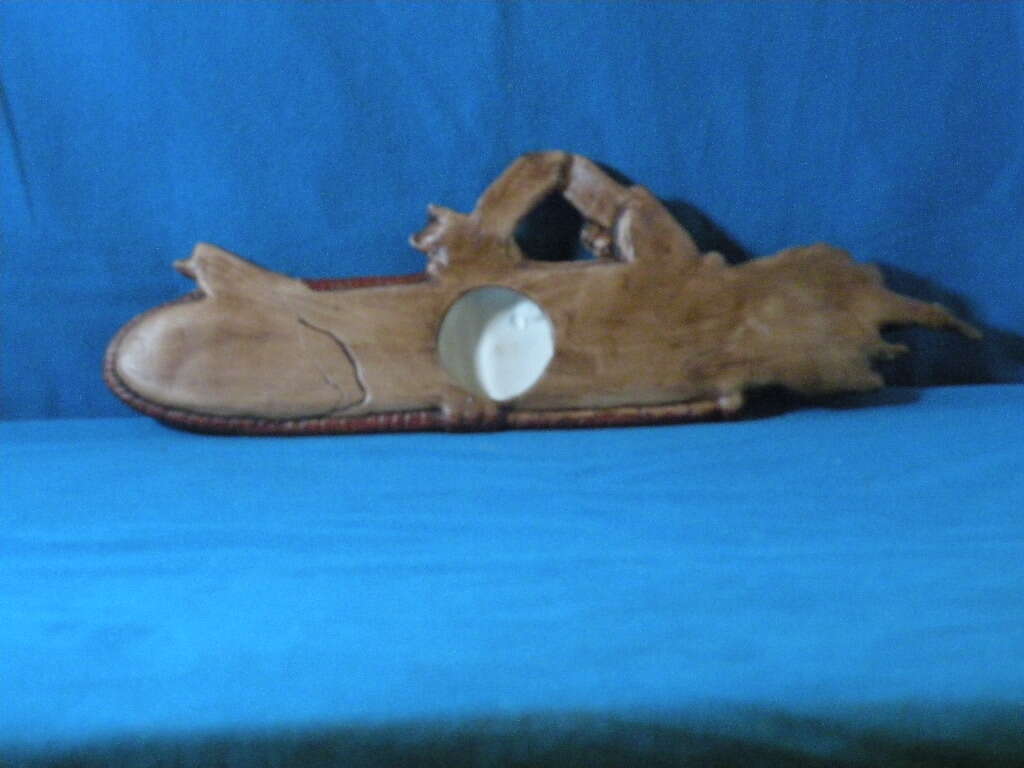 Native American Ceramic Arrows in Quiver w Strap, Hand Painted w Aztec Design. This is a unique ceramic replica of arrows and a quiver. The ceramic looks like leather and the design is done with beads in ceramic. The back looks like wood and is painted. Has hole in middle of back for hanging. 131/2 X 41/2 inches. 14.8ounces.
