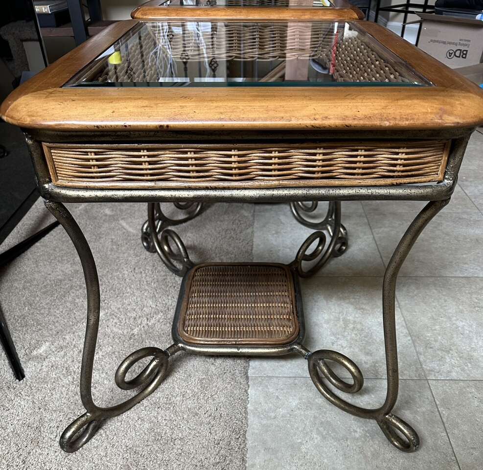 Glass top - no damage Pine wood top frame, distressed for a natural look Wicker inserts Metal body and feet
