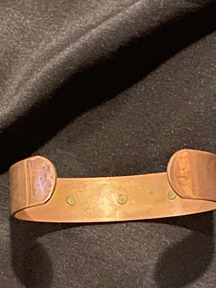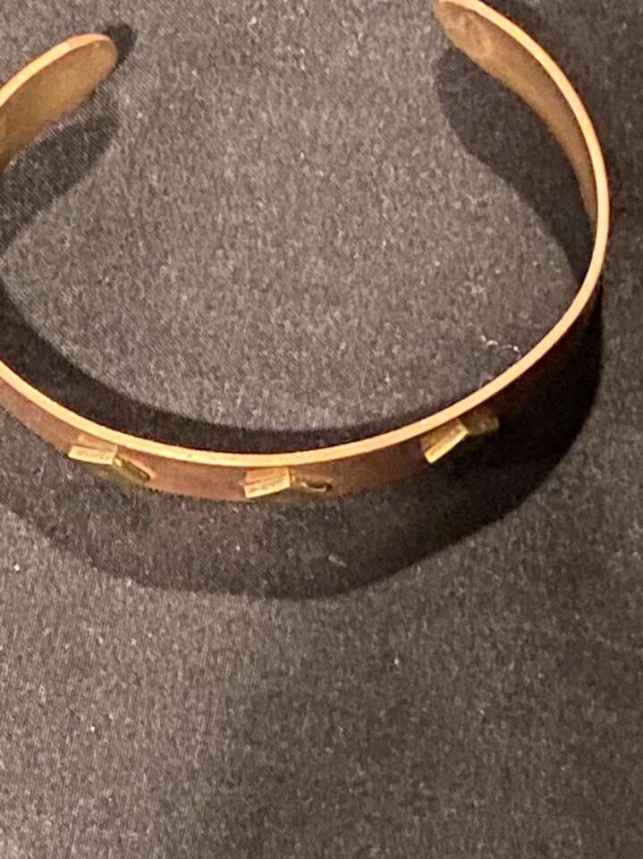 Copper Bracelet With Three Diamond Shape Brass Charms Embedded In Copper.