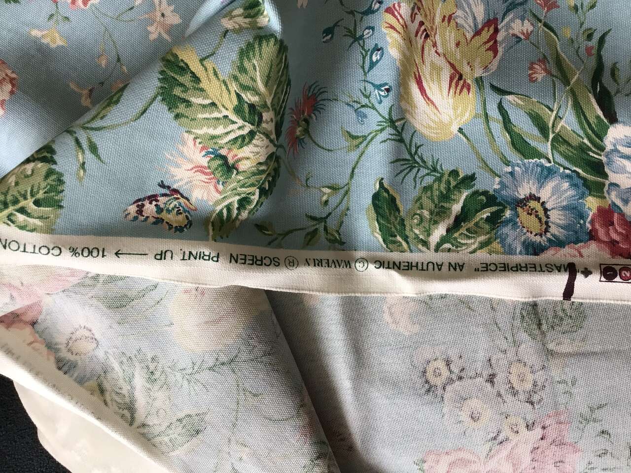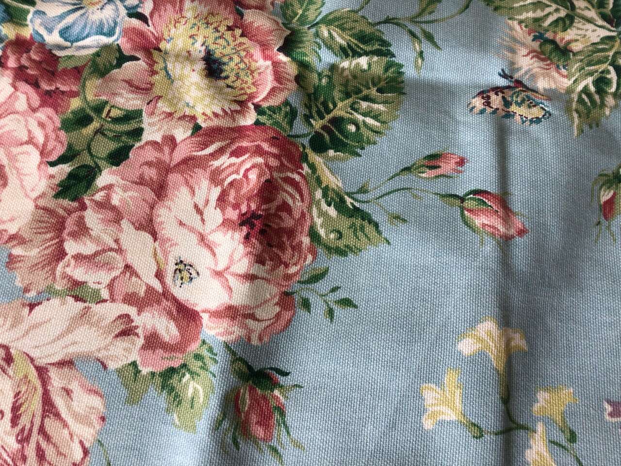 Waverly "Masterpiece" blue multi floral, remnants 2 5/6 yd x 28/29" + attached piece and 18.5" x 26" wide, $8