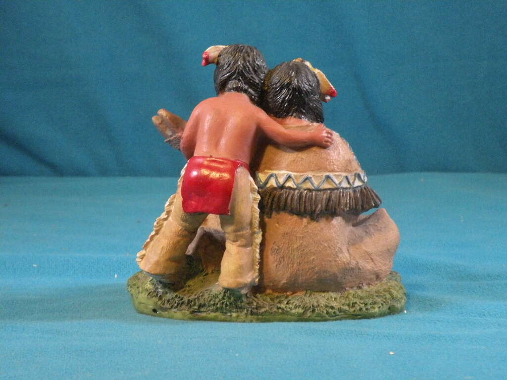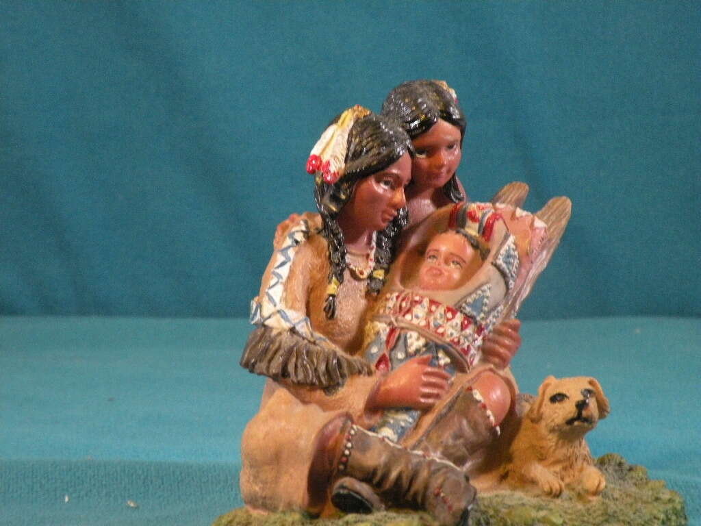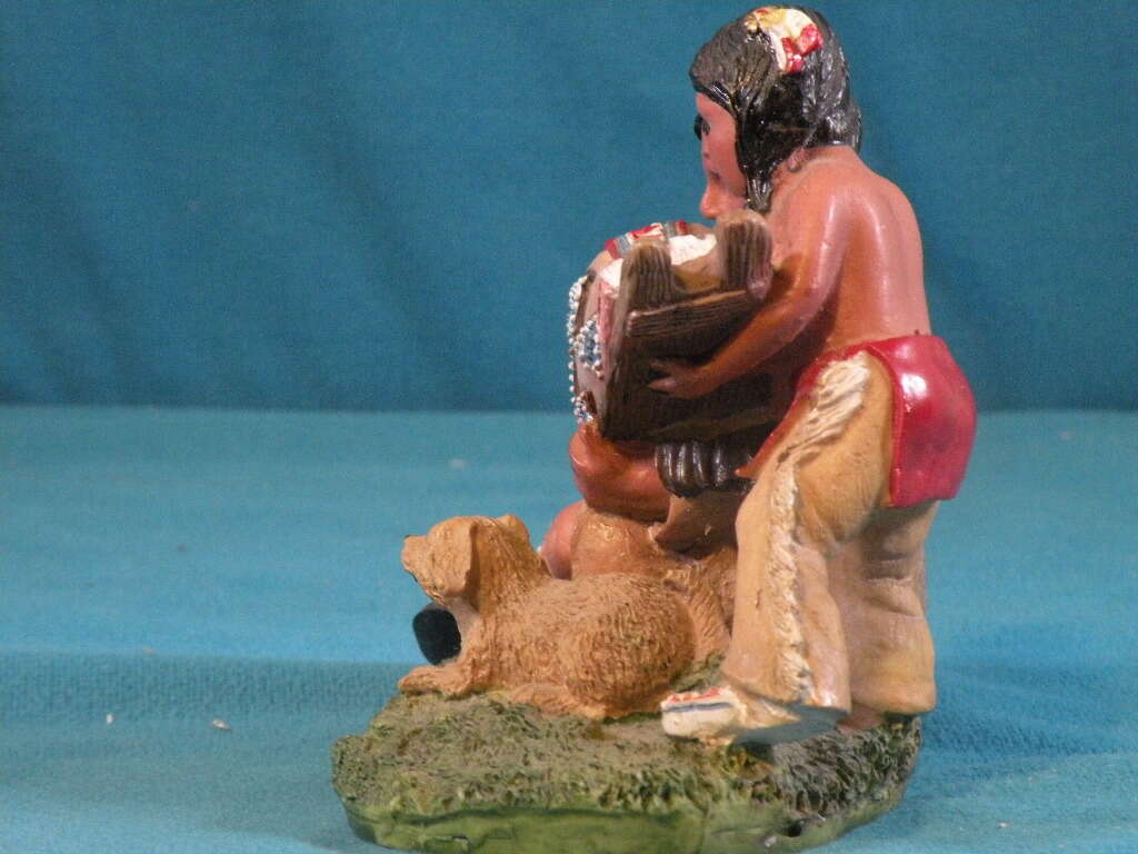 Native American Indian Woman with Child andBaby. Excellent condition. Ceramic, Poly Stone. Hand painted. 5x6 inches. Indian Maiden with small boy with arm around her and she is holding a baby with dog beside her.