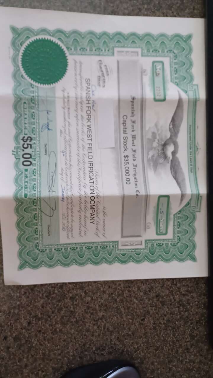 1 and 1/2 share of Westfield Irrigation Water. Will sell separately or both. $12,500 for both, or 8500.00 for the 1, & 4250.00 for the half.