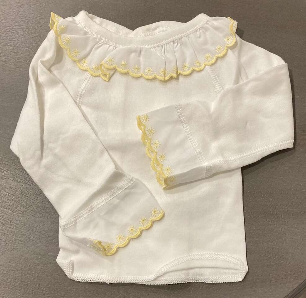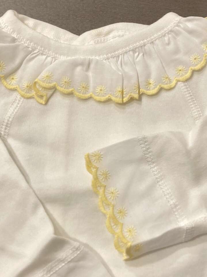 VenmoStill new in package. Made by Janus of Norway. This adorable top is 100% cotton and features an embroidered yellow Peter Pan collar and decorative wrists. It is size 0-3 months. It would make a unique baby gift.