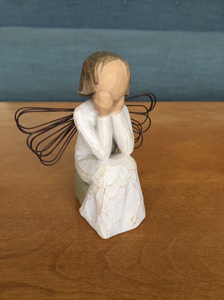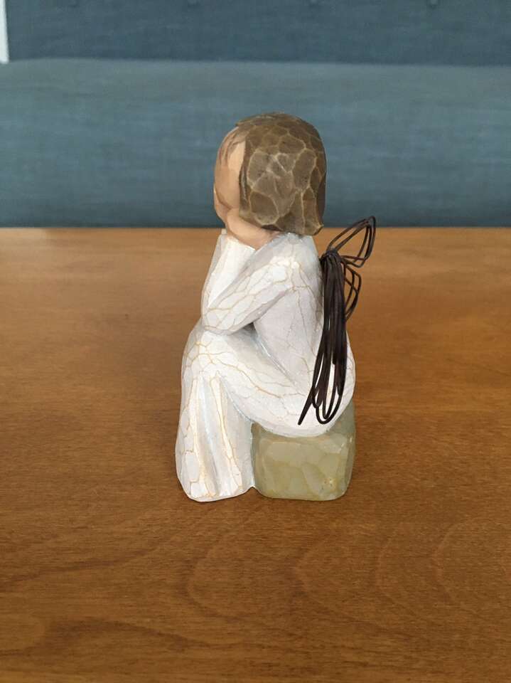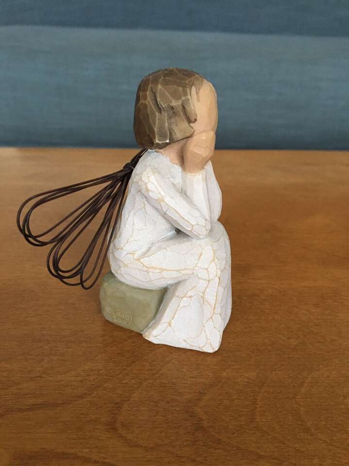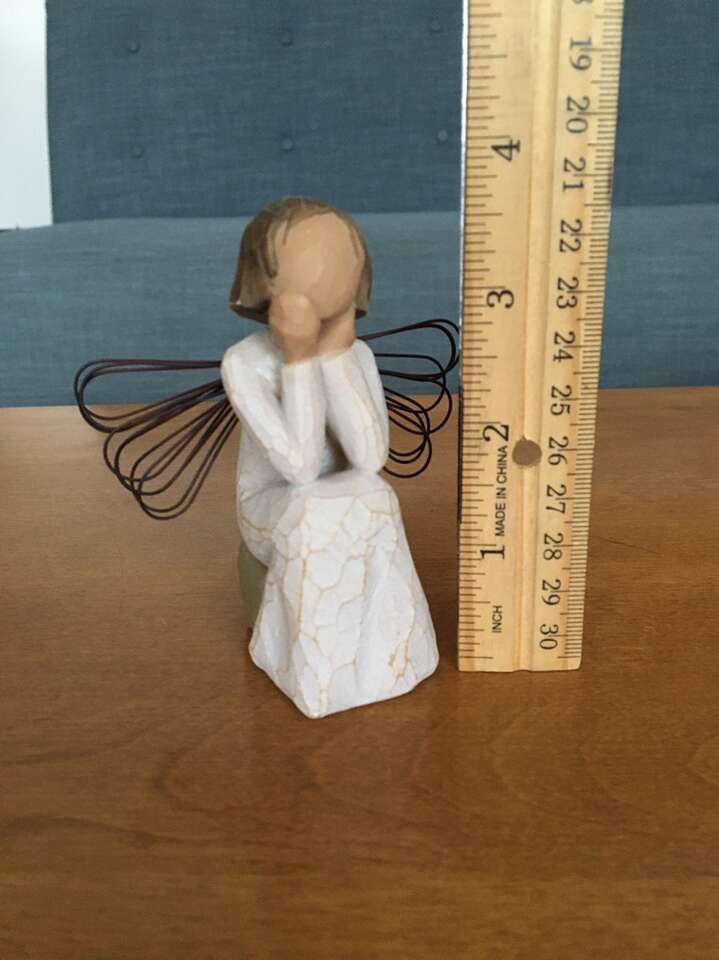 Willow Tree “Angel of Caring” DEMDACO collectible figure, by Susan Lordi, 2001. Seated angel, short hair, wire wings, chin cupped in hands. Hand-painted resin, 3.75” tall, excellent condition. Text only. Cash or Venmo.