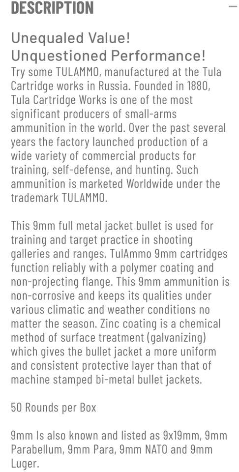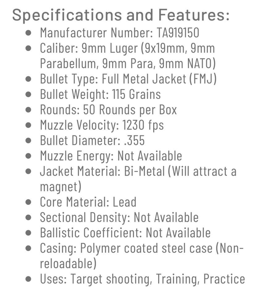 Description- 1000 rounds (20 boxes of 50 rounds each) 9MM Luger, 115 grain FMJ steel case ammunition. See photos for more product information and specifications.