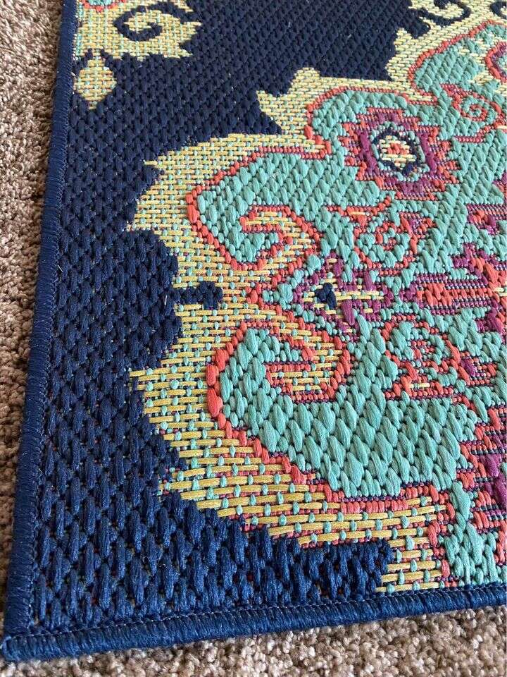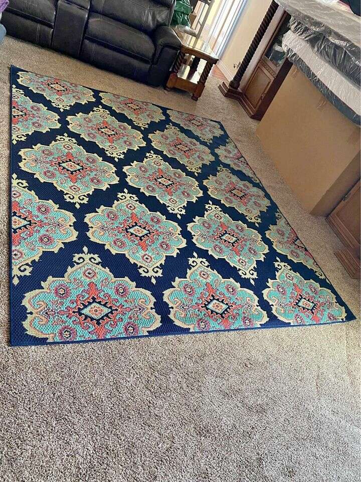 This rug is brand new can use indoor or out door. Its very soft, It’s 8’x10’