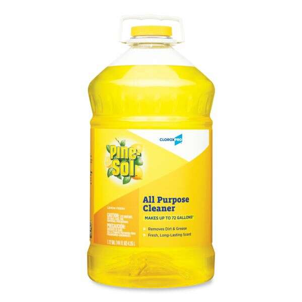 Product Description Pine-sol All Purpose CleanerCloroxPro Pine-Sol All Purpose Cleaner gives you 4X cleaning action cutting through dirt, grime and grease, while deodorizing throughout your home, office or commercial facility and a great, long lasting scent. This concentrated formula cleaner can tackle any challenge; just mix Pine-Sol with water at different strengths to adjust your cleaning power each time, unlike premixed cleaners. Pine-Sol All Purpose Cleaner is safe to use on most hard non-porous surfaces including finished hardwood, ceramic tile, linoleum, plastic, and leaves no sticky residue. It's ideal for use in offices, day care centers, schools, hotels, restaurants and other commercial facilities. With the power of Pine-Sol on your side, you only have to clean once to get the job done right. Application: Multipurpose Cleaner; Applicable Material: Ceramic; Fiberglass; Glass; Laminates; Metal; Plastic; Sealed Cement; Sealed Stone; Vinyl; Dirt Types: Bacteria; Dust; Germs; Grease; Grime; Mildew; Oil; Soil; Scent: Lavender Clean®. Clorox Professional, Pine-sol All Purpose Cleaner, Lavender Clean, 144 oz Bottle