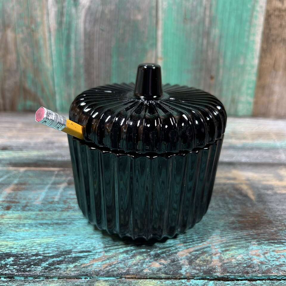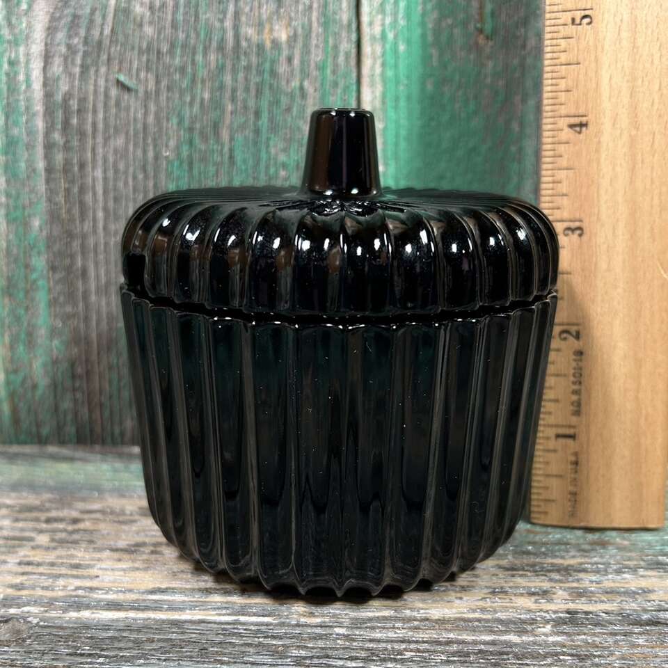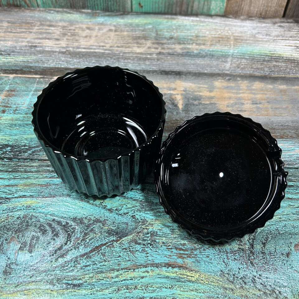 RARE & Vintage Black Amethyst Glass Condiment Jar with textured surface with evenly spaced ripples or ridges. Perfect for Jam, Jelly, Mustard, BBQ Sauce or Hot Sauce, etc. About 4” at highest point X 4” diameter. Photographs are of the exact item you are buying. No chips, cracks, scratches or defects. Smoke free. Delivery available to a convenient location when in your area for $5.