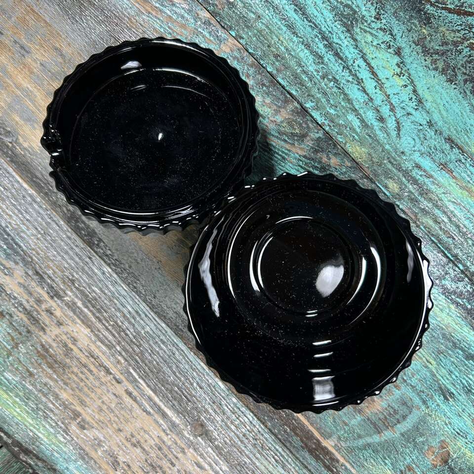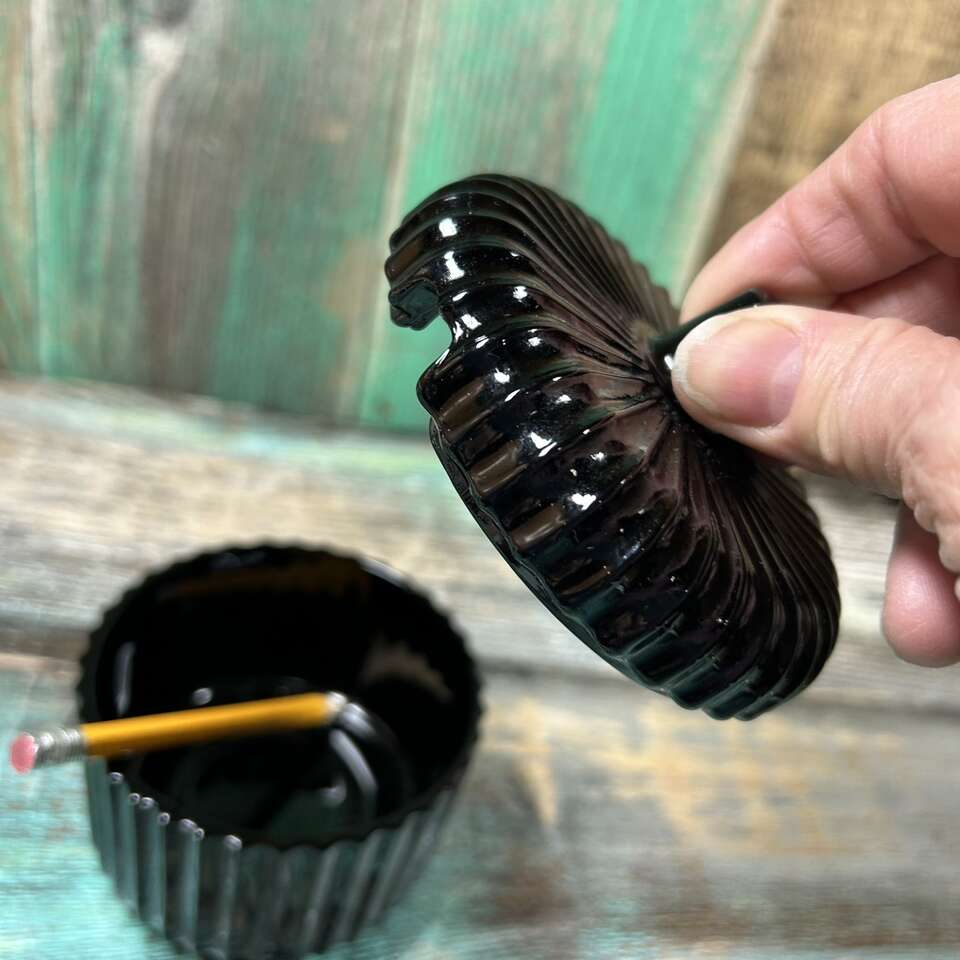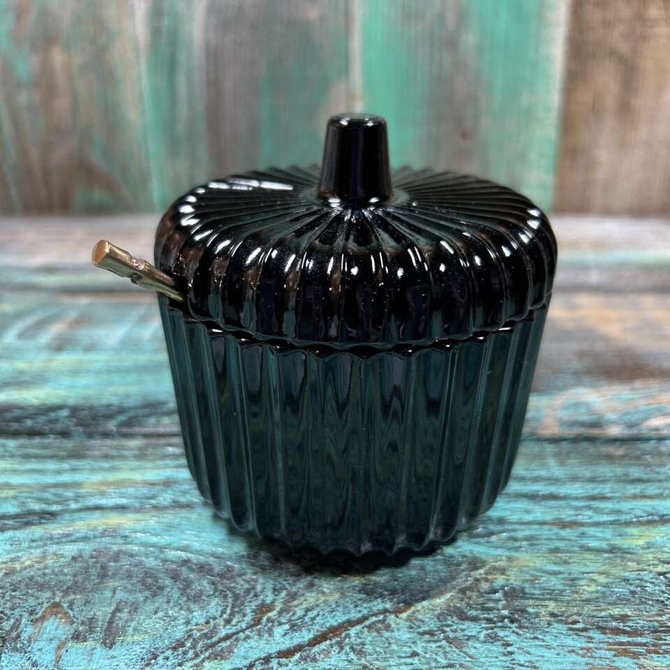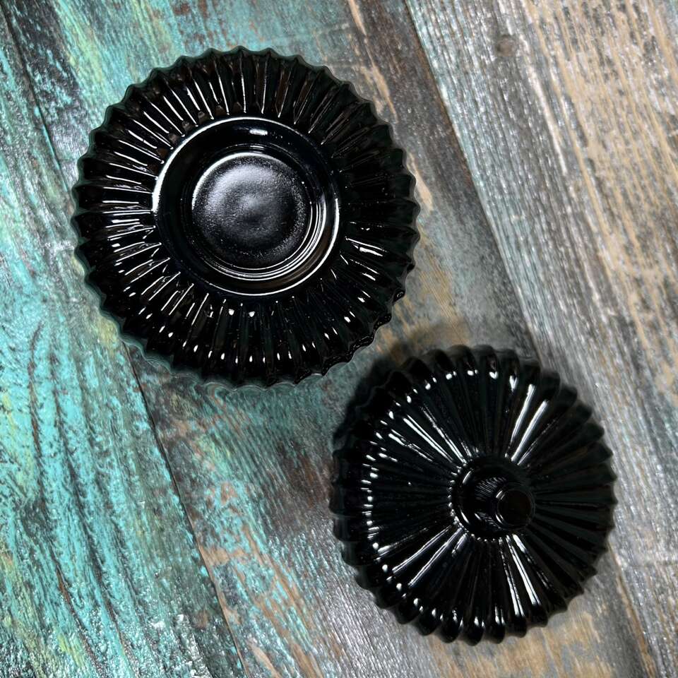 RARE & Vintage Black Amethyst Glass Condiment Jar with textured surface with evenly spaced ripples or ridges. Perfect for Jam, Jelly, Mustard, BBQ Sauce or Hot Sauce, etc. About 4” at highest point X 4” diameter. Photographs are of the exact item you are buying. No chips, cracks, scratches or defects. Smoke free. Delivery available to a convenient location when in your area for $5.