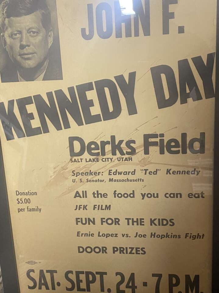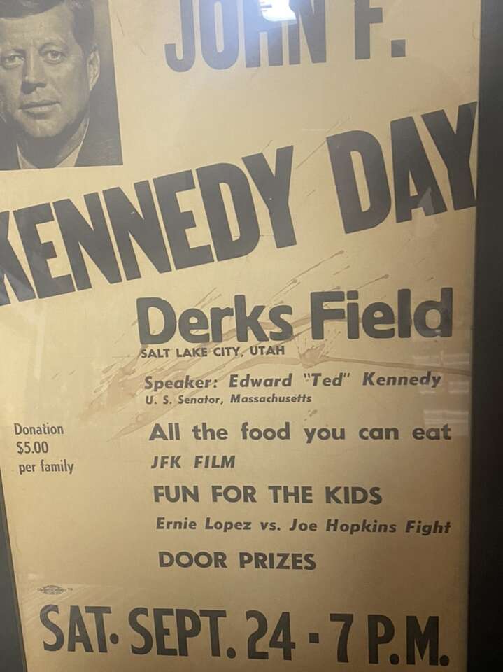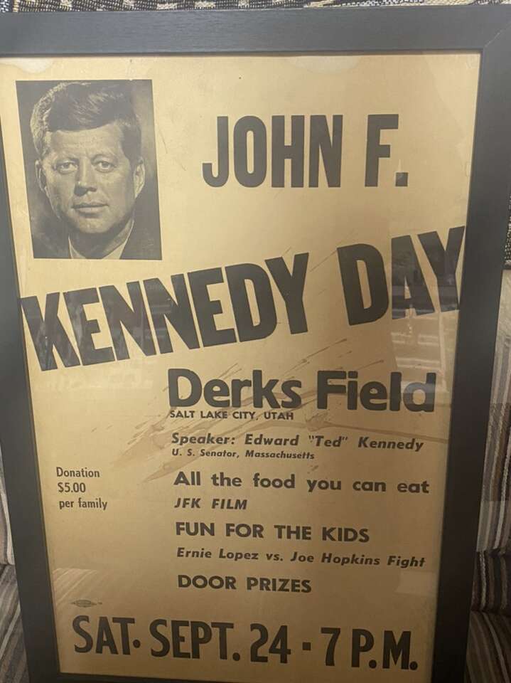 Late 1950s “John F Kennedy” Campaign Poster With “Edward Ted Kennedy” As Speaker At “Derks Field Base Ball Field”In The Late 1950s. Poster Is 14” By 22” In A Black Wood Grained Picture Frame With A Certified Union Stamp In Salt Lake City By Allied Printing. Poster Is Made Of Heavy Cardboard. Poster Has Lots Of History Here In Utah With Derks Field Being Posted On It Along With Two Professional Fighters “Boxers” Ernie Lopez Vs Joe Hopkins Who Where Originally From Here In Utah, Our 35th US President John F Kennedy And His Brother Senator Edward “Ted”Kennedy. Very Rare Vintage Poster Sign. Utah History &125