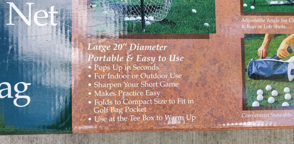 -Large 20" diameter Net is portable and easy to setup -Adjustable angle for Chip & Run or Lob Shots -For indoor or outdoor use -Sharpen your Short Game and make Practice Easy -2-Piece collapsible shag bag holds up to 70 golf balls (no golf balls included) -Collapsible for Easy Storage -Shaft stows away inside of Shag Bag -Eliminates the hassle of shagging balls and bending over -Helps make the most of practice time