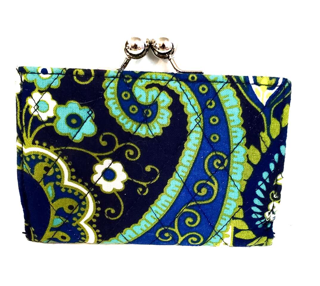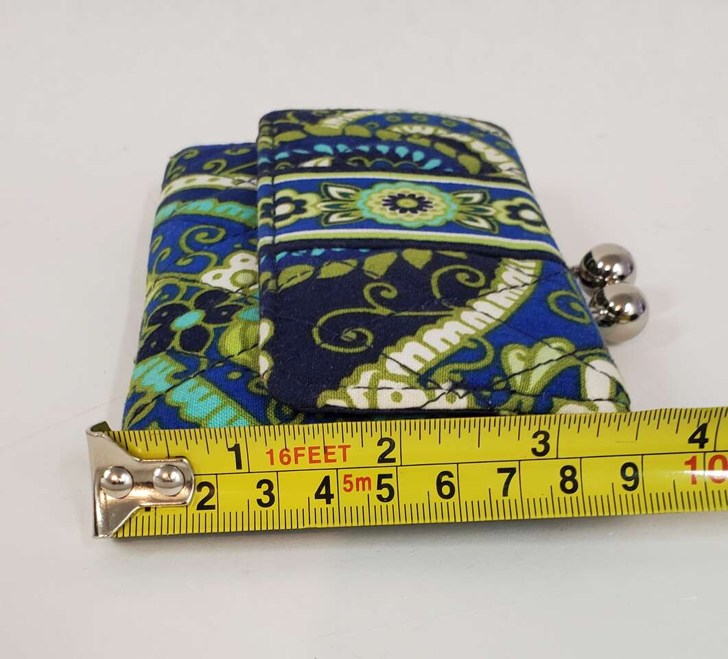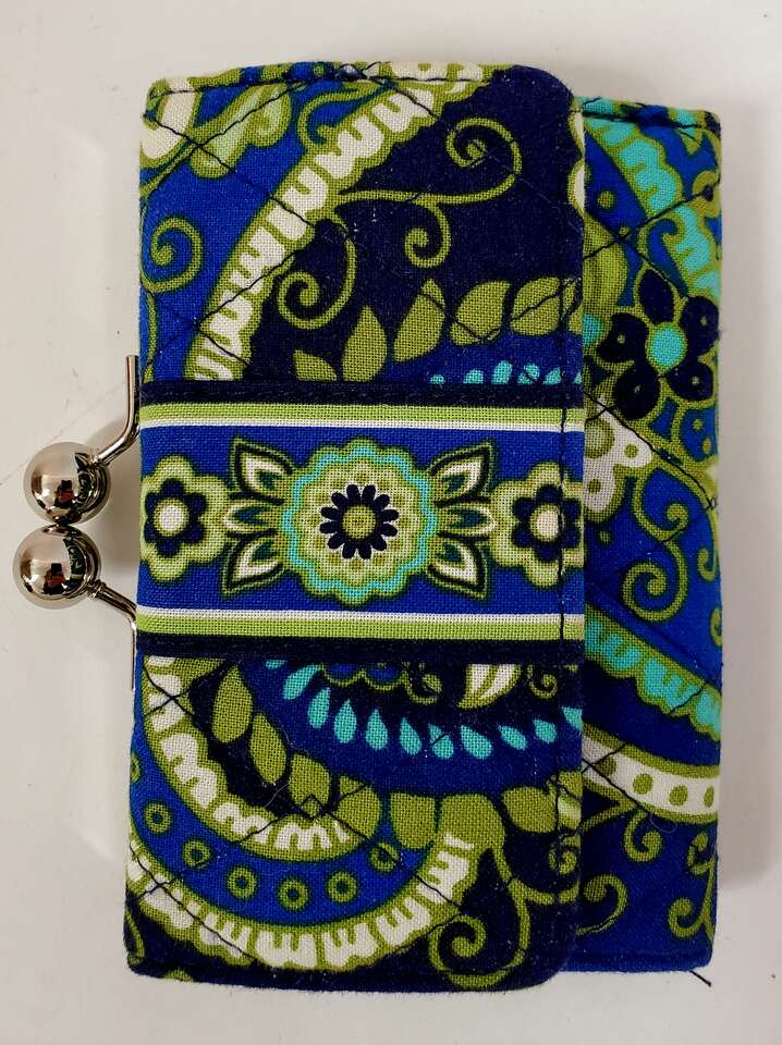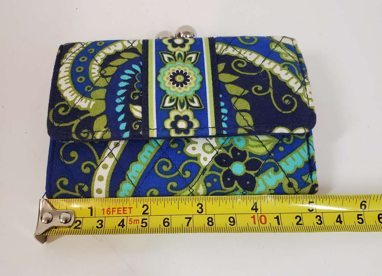 Vera Bradley Wallet Blue Green Quilted Floral Trifold Kisslock Small Wallet with Magnetic Closure. Inside of Wallet has a Pocket for Cash, a Window for ID, a Pocket for Change and Three Card Pockets.. Cash Only, No Codes