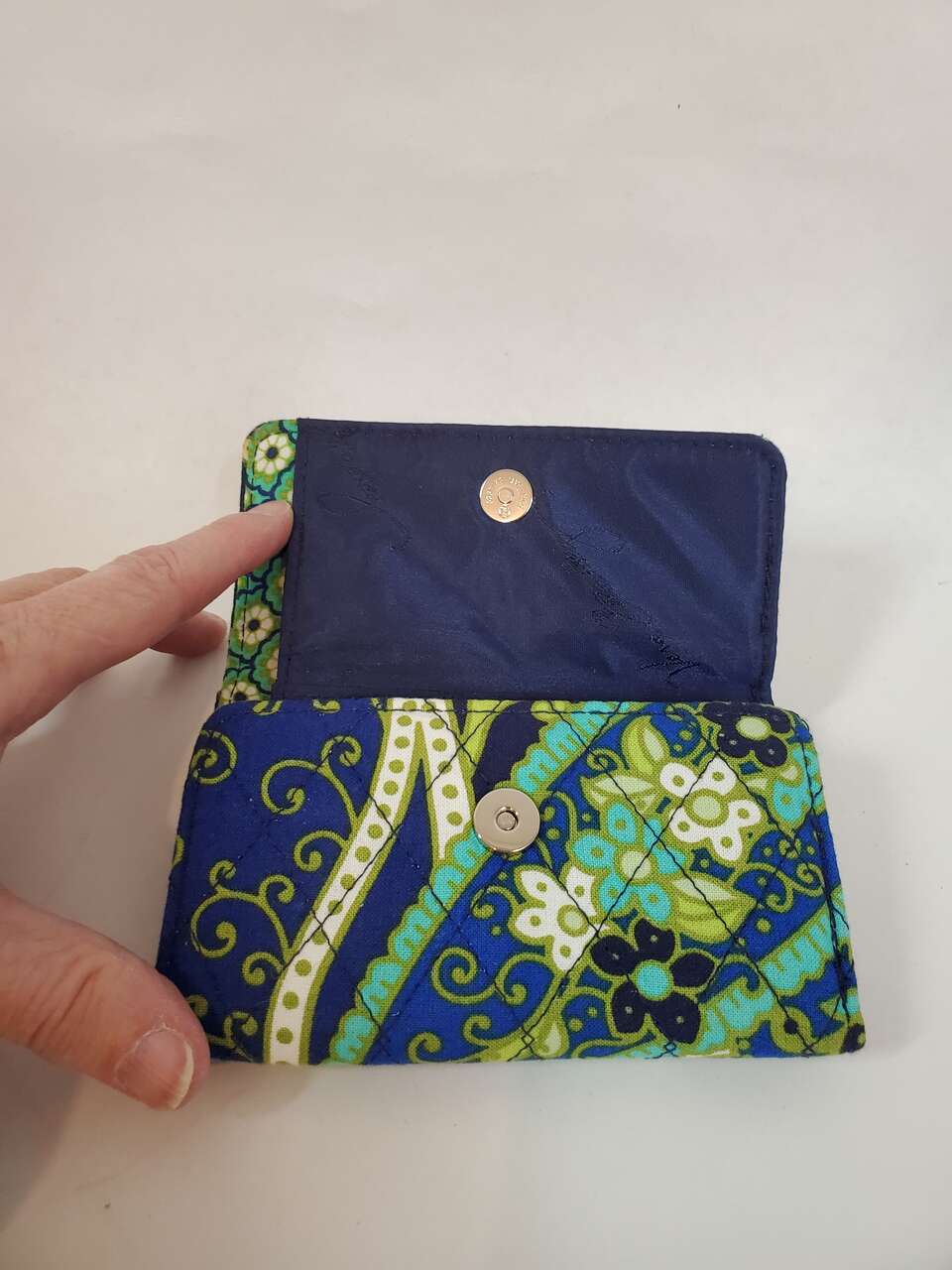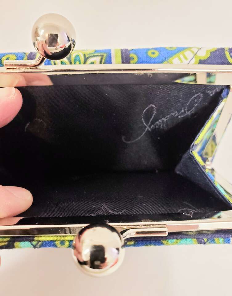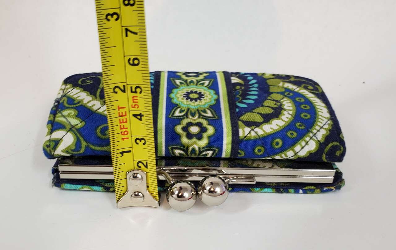 Vera Bradley Wallet Blue Green Quilted Floral Trifold Kisslock Small Wallet with Magnetic Closure. Inside of Wallet has a Pocket for Cash, a Window for ID, a Pocket for Change and Three Card Pockets.. Cash Only, No Codes