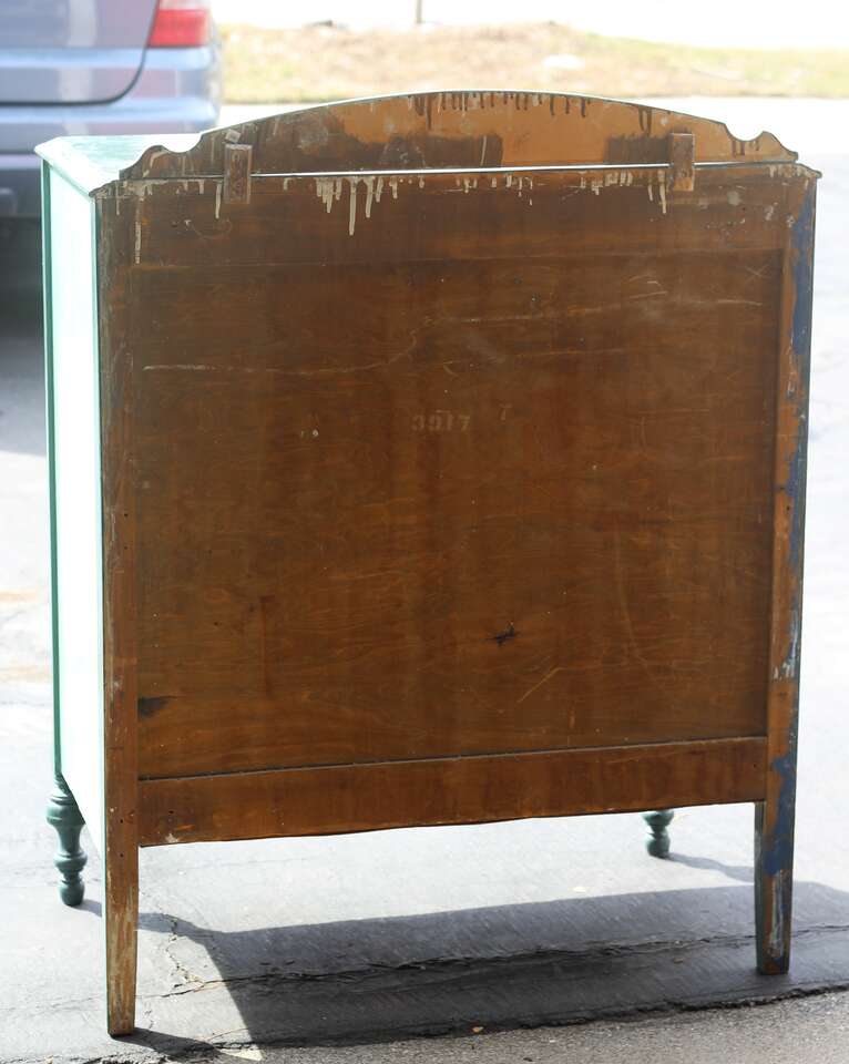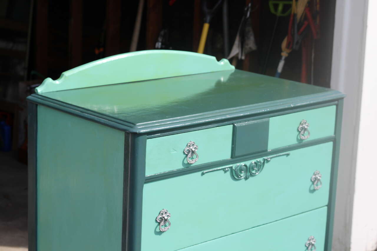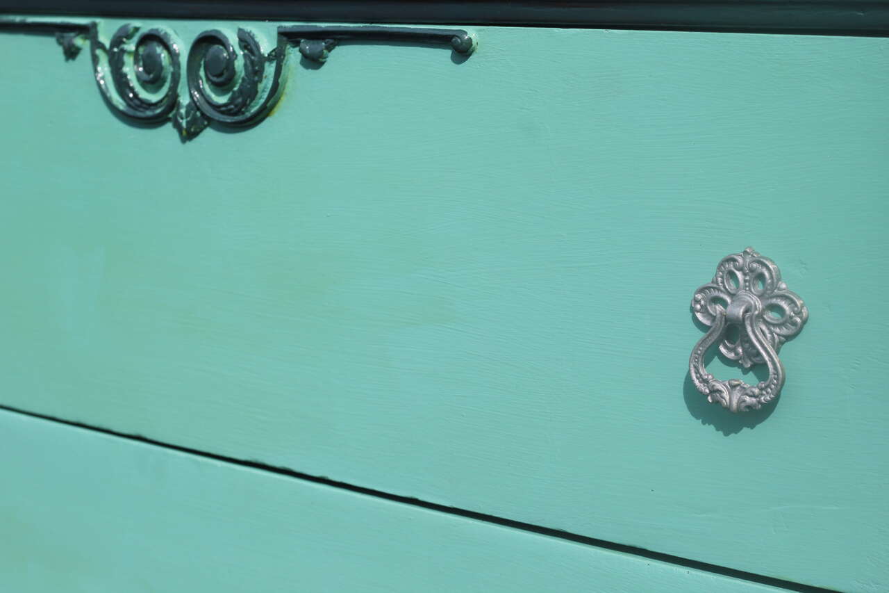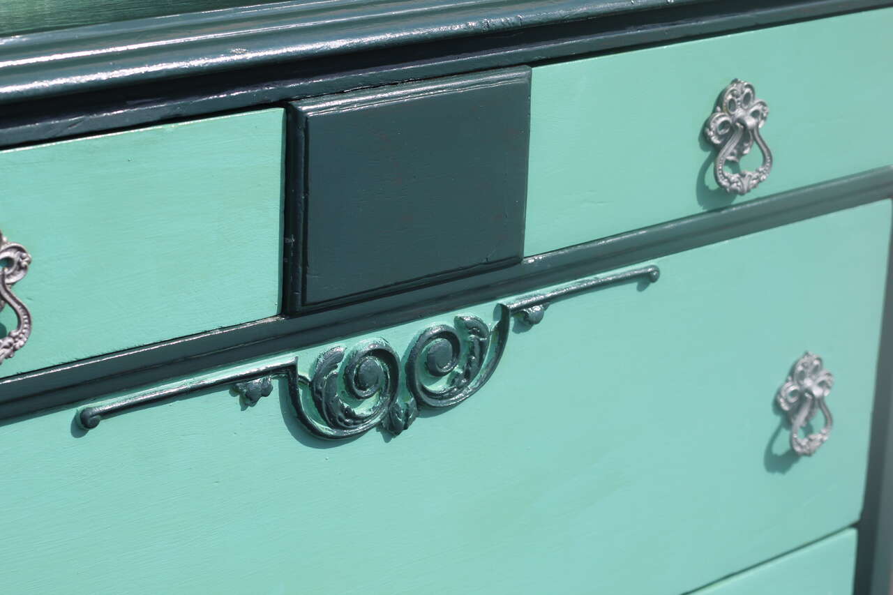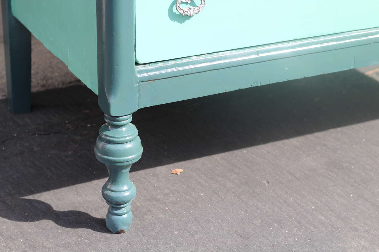 Newer 2-tone (mint and teal) paint with silver hardware. Some recent work also one on the drawers so they function well / properly--considering the age and box type construction.