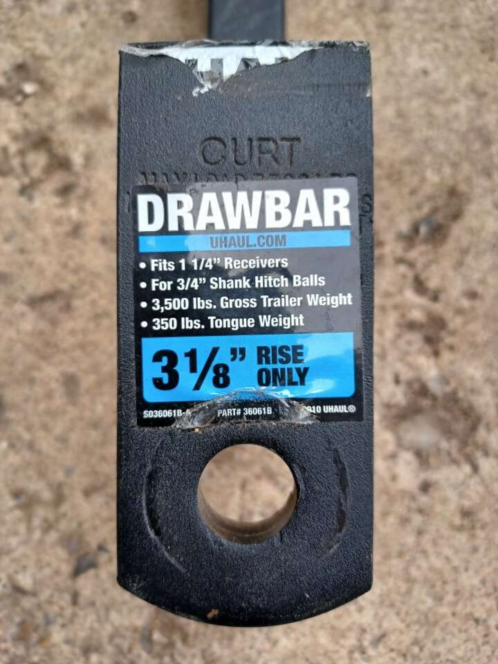 This is a barely used, Uhaul brand drawbar. It has a 3 1/8" rise only. It fits 1 1/4" receivers. $ 10.