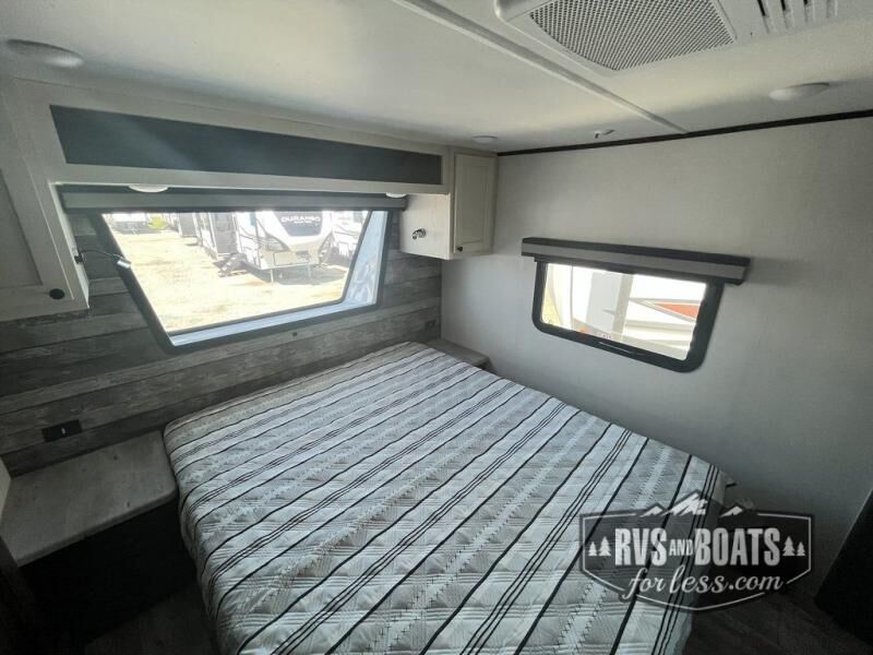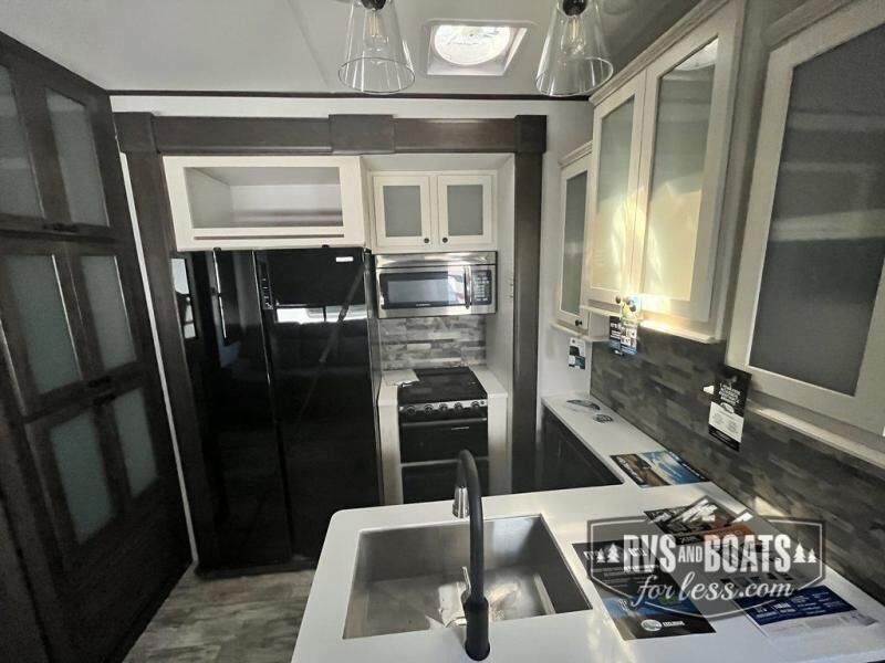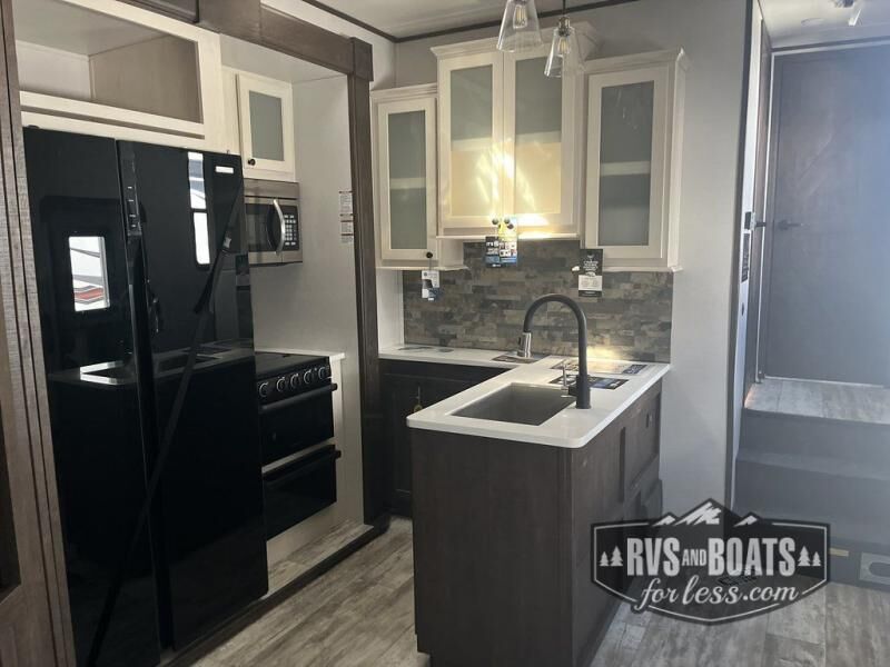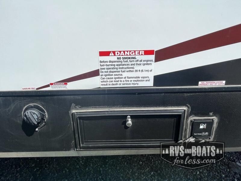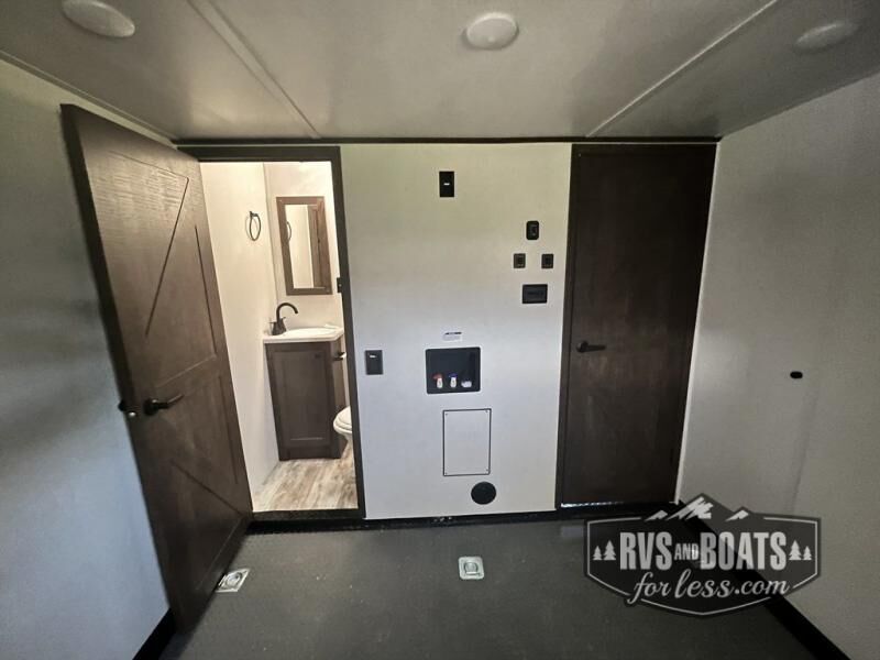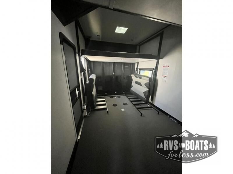 It's a clean decision with a bath and a half to take this toy hauler on your next vacation! There are plenty of sleeping spaces for everyone between the opposing sofas with a bed above them, a loft, and a king bed in the front private bedroom which also has a wardrobe slide. The 14' garage area has enough room for your toys and you can know they will arrive safely with the 5,000 lb. cargo tie downs. You even have a half bathroom in the garage area and one of the dual entry doors to the unit. Relax each night in true comfort on the sofa slide across from the electric fireplace at the entertainment center, and keep your belly full with the cast iron cooktop and 17" oven. Stay squeaky clean with the shower with a seat in the full bathroom too!