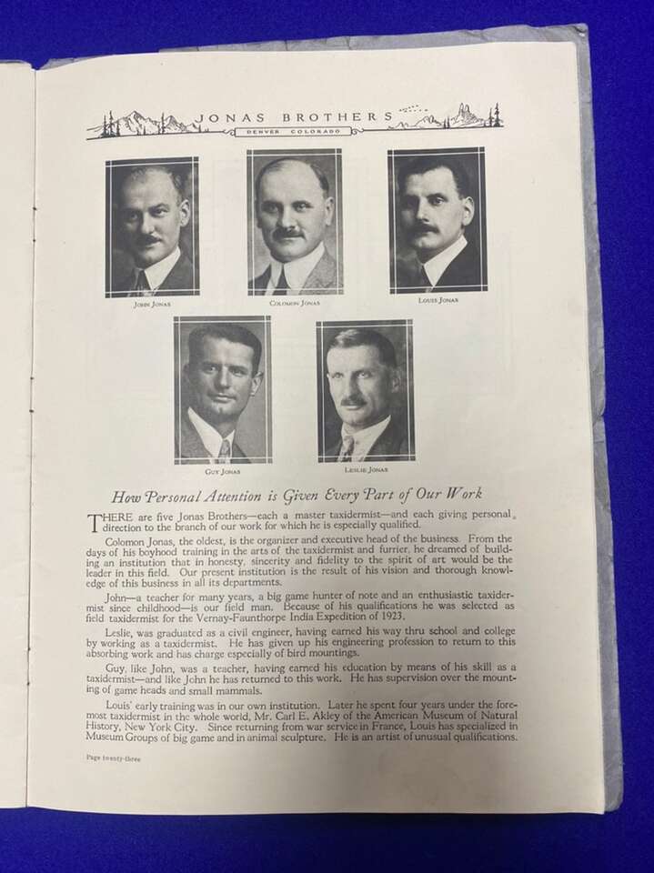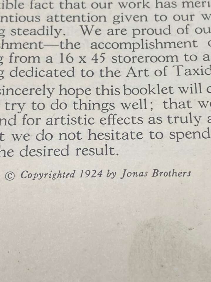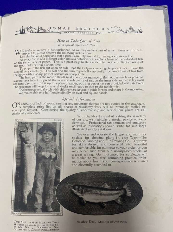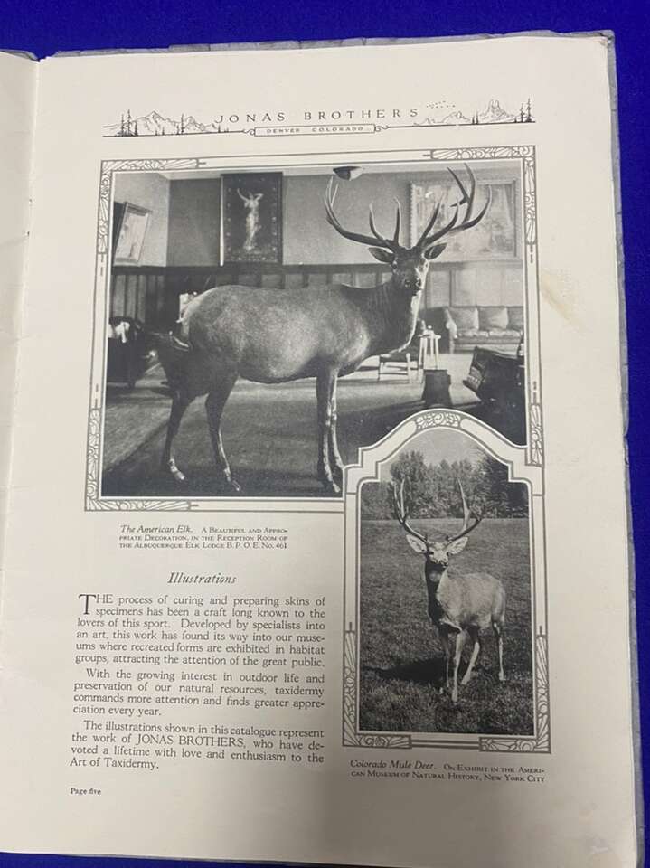 Date 1923 ART OF TAXIDERMY “JONAS BROTHERS”. Very Rare Book That Was Distributed In 1923 In There First Shop In Denver Colorado. This Is There Very First Book Put Out To The Public. A lot Of There Art Is Still Be Displayed In Museums In New York And Other Parts Of The World. $45