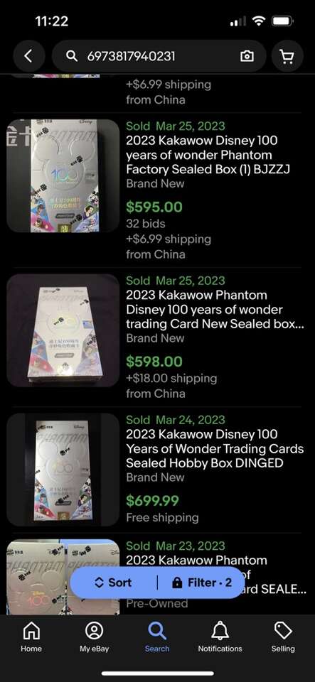 2023 Kakawow Disney 100 Years of Wonder Trading Cards Sealed Hobby. Collectors item for sure. Disney fans are going crazy for these. I have the last eBay sold prices in the second photo. Steadily been going up for 2 weeks. Very hard to find in the U. S.